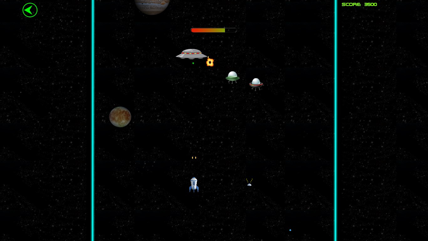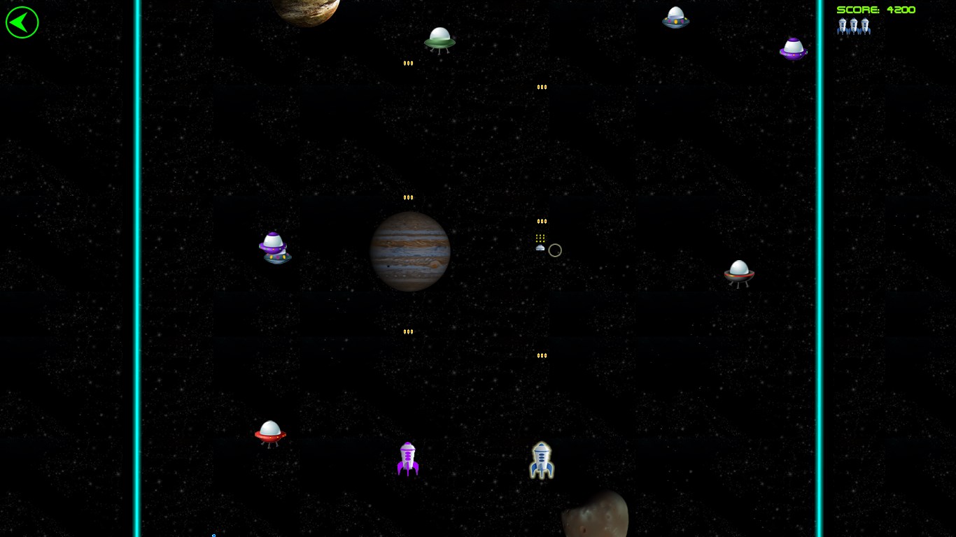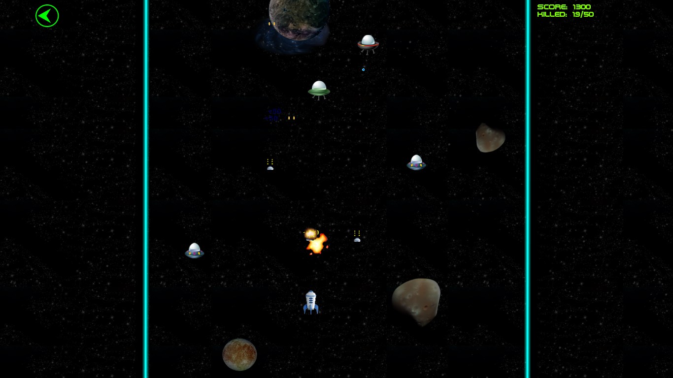 Space shootingDifferent types of aliensControls: touch, mouse, keyboardBonus items: rapid fire, single shoot, double shoot, triple shoot, quad shoot, penta shoot, spread shoot 2/3/4/5, shield, mirror, extra lifeLeaderboardsDifficulty levelsPlay modes: adventure and endlessChallenges: timed, reach score, survive waves, destroy aliens, collect bonus