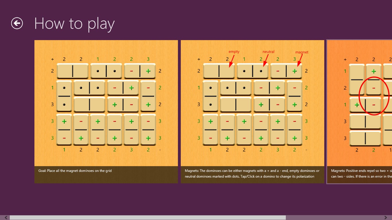 The goal of the game is to place magnets on the board so that all the clues about how many positive and negative magnet ends you should find in each row and column are satisfied.