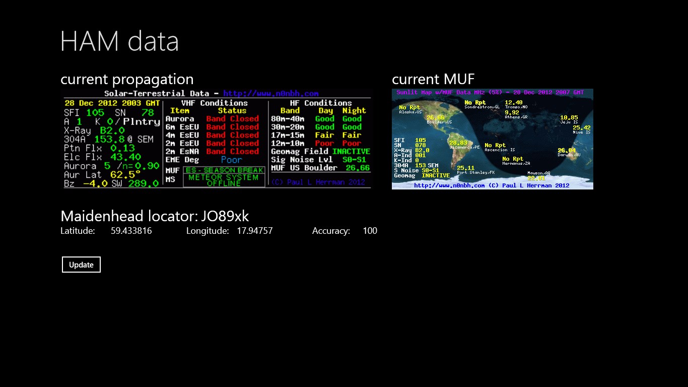 This app displays the current solar terrestrial data, MUF and the Maidenhead locator for your current location.