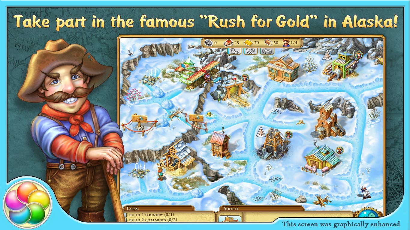 Who says the time of the great gold prospectors has passed?! You have an opportunity to be one yourself. Explore locations for gold and other useful resources, protect your workers from wild animals and robbers, and build the town of your dreams in Alaska!