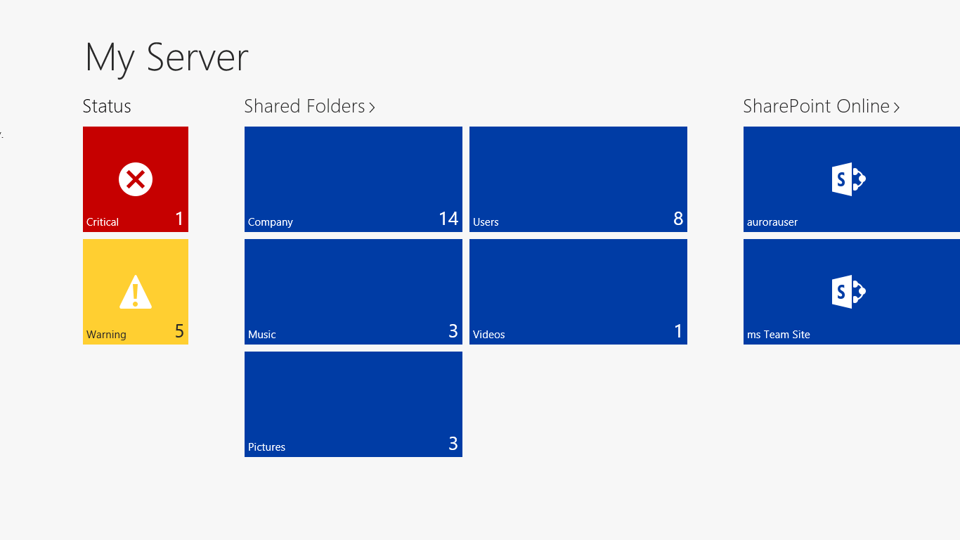 My Server 2012 R2 for Windows 8 is an application designed to help you keep seamlessly connected to your server resources through devices running Windows 8. With My Server, you can manage users, devices, alerts, and access shared files in Windows Server 2012 R2 Essentials. In addition, files that you have recently accessed with My Server files continue to be available to you even when offline.