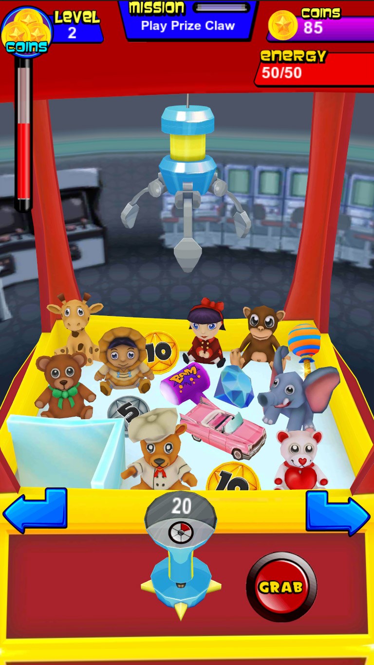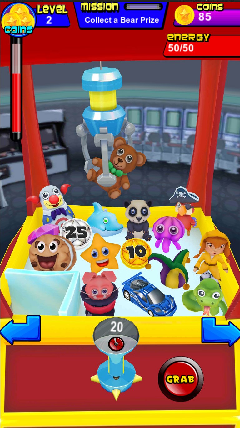 More than 60 prizes to collect!Multiple machines to play on with different prizes, powers and looks!A special puzzle to complete for each machine!New 3D graphics with customizable machines, claws and joysticks!Simple to play but with tons of missions to challenge your skills!Earn more bonuses for playing every day!Huge variety of bonuses and effects!