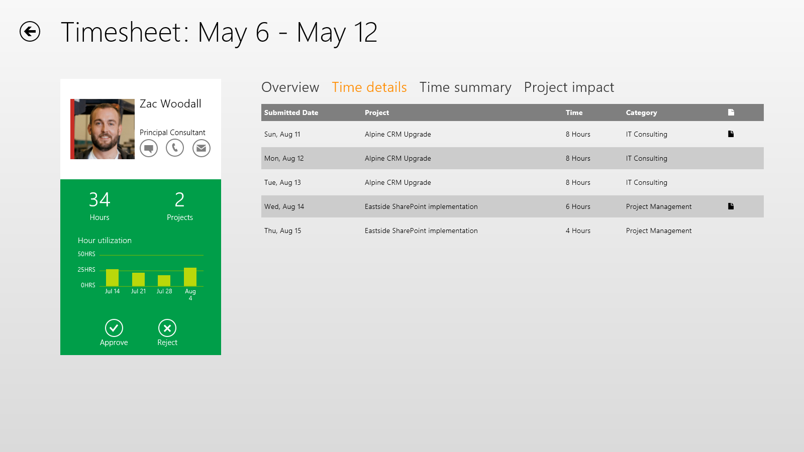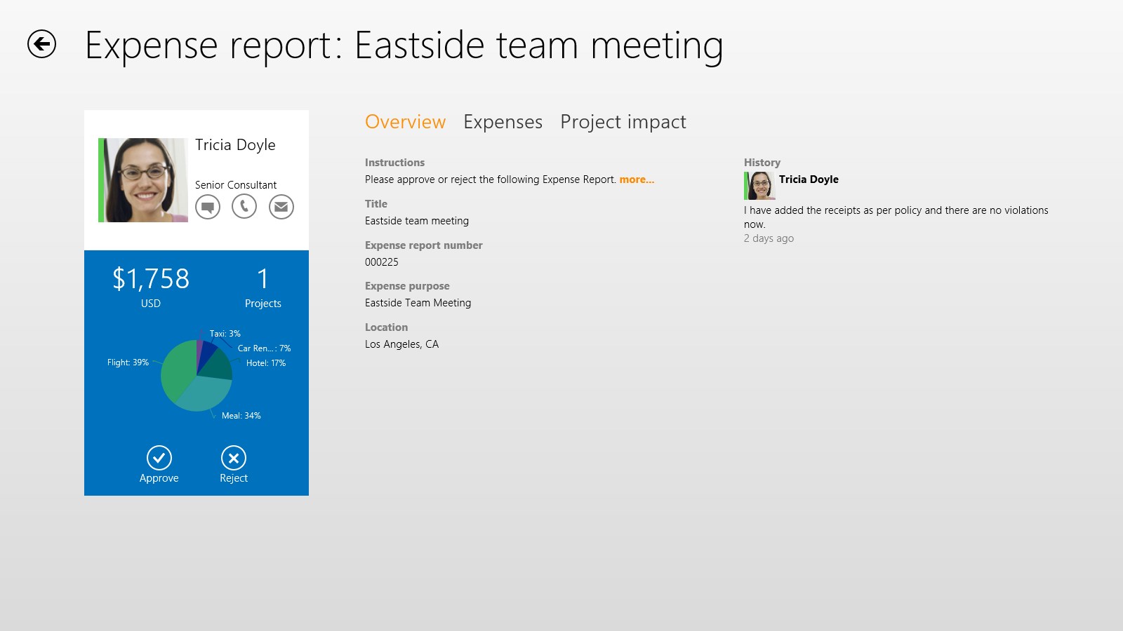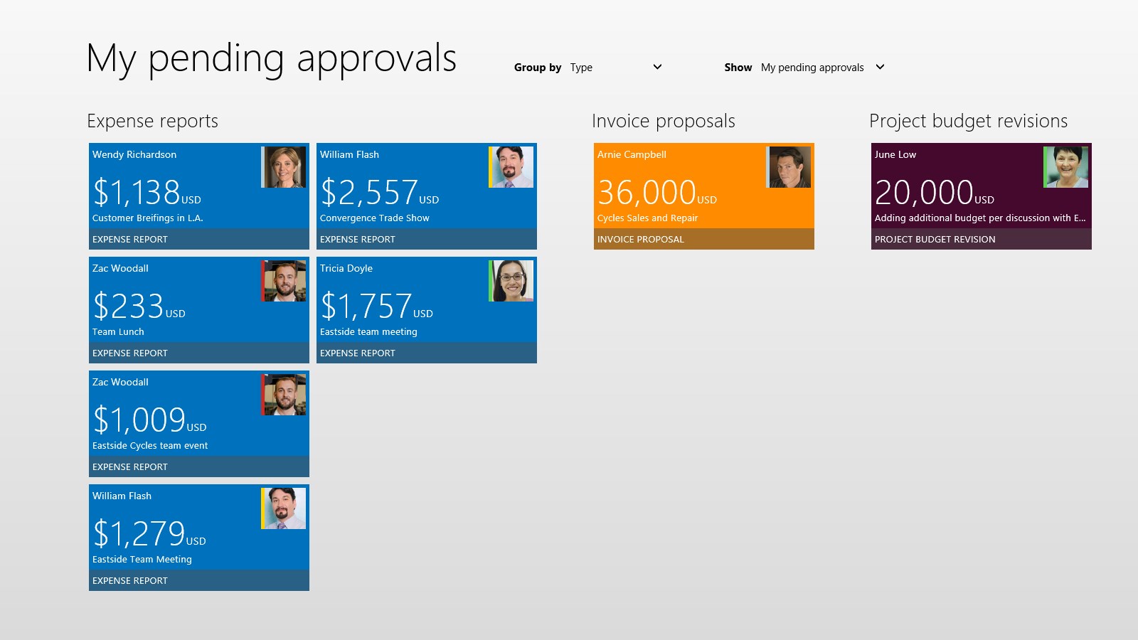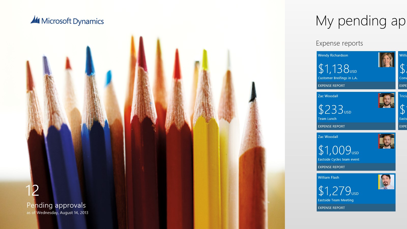 Manage approvals with the Dynamics AX 2012 Approvals app in conjunction with Microsoft Dynamics AX 2012. Approval types include expense reports and timesheets.