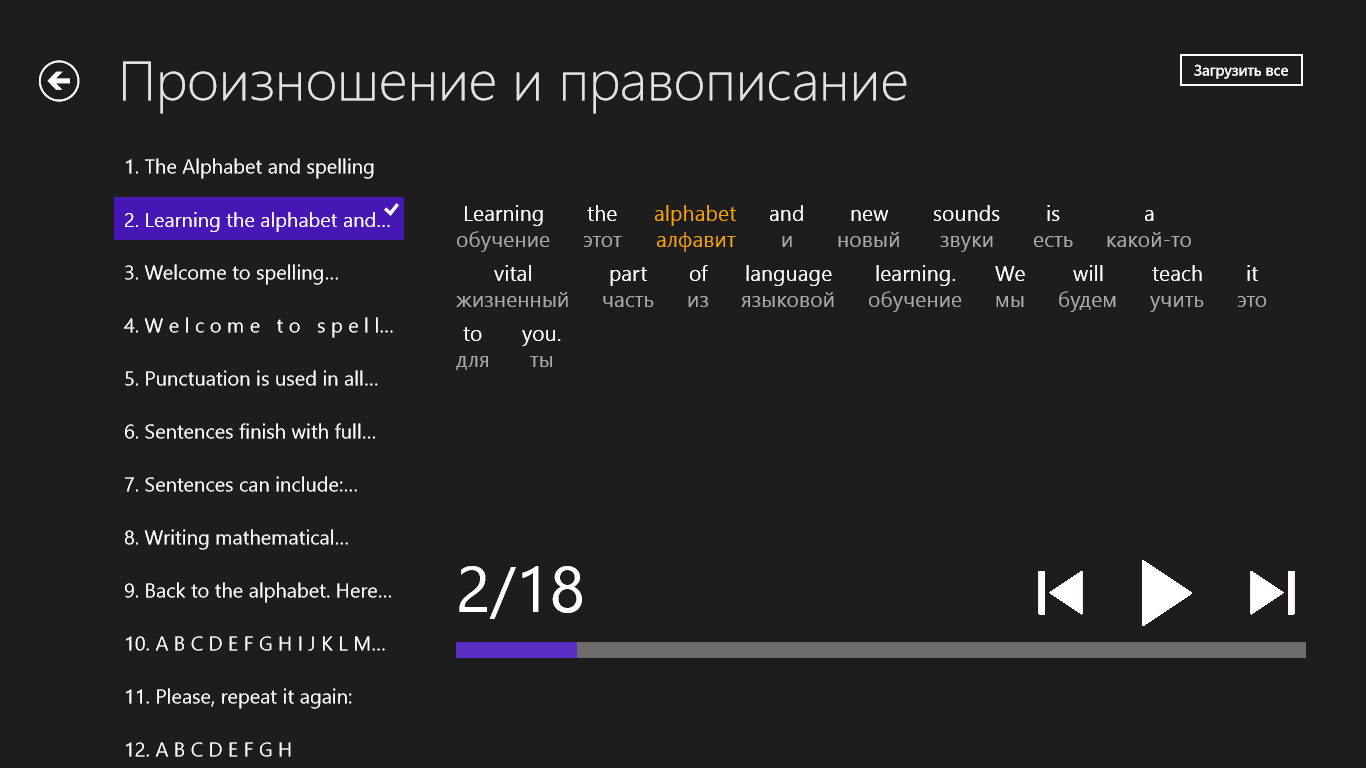 * Орфография и произношение: 7 минут, 18 предложений, 158 уникальных слова