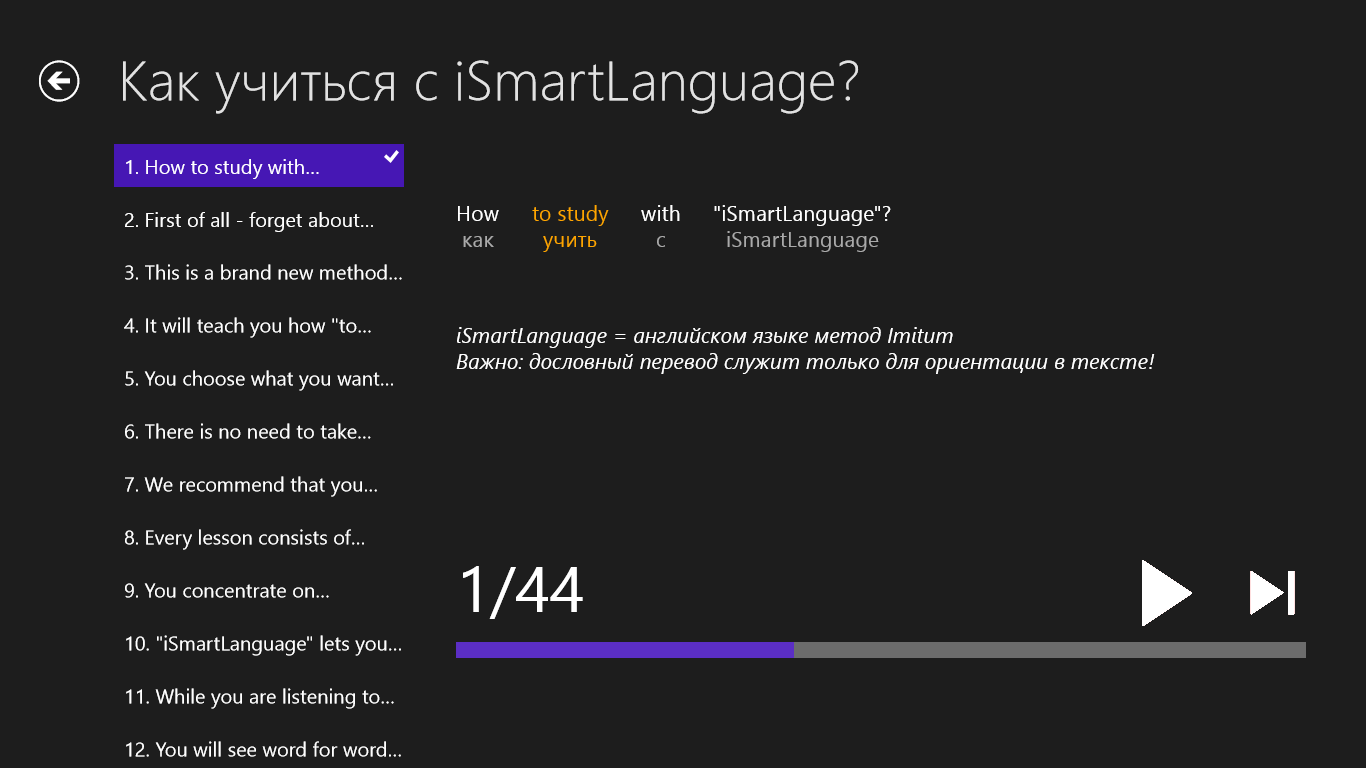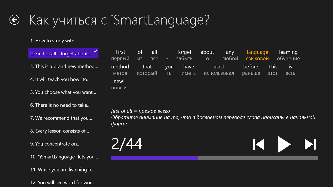 Обучение иностранному языку при помощи научно-доказанной уникальной методике, которую испытали на себе тысячи наших клиентов по всему миру. Это самый эффективный метод изучения иностранных языков для самоучек. Используйте при обучении 97% своих органов чувств и логическую память – самый эффективный вид памяти, когда информация запоминается целыми логическими блоками (например, целая история или предложение). Таким способом дети учат свой родной язык, почему бы и вам не попробовать?