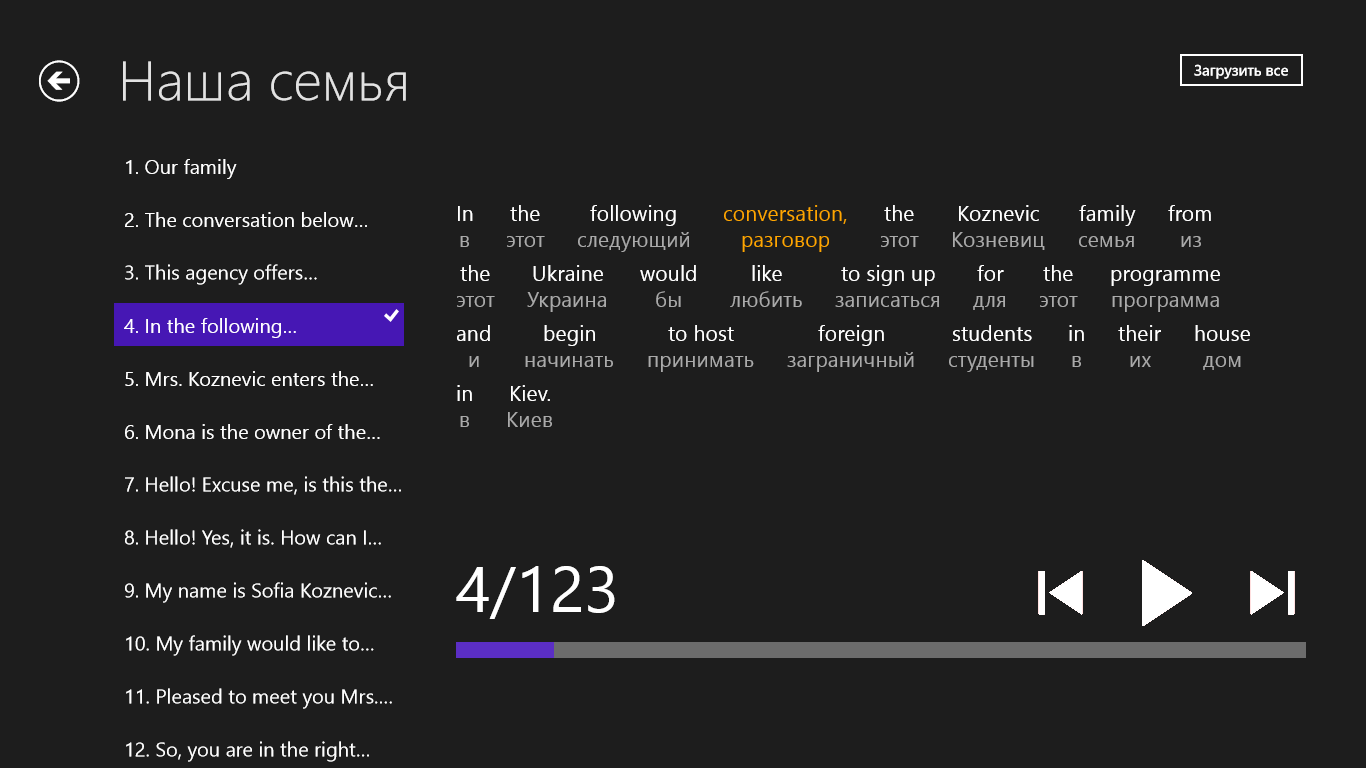 Приложение доступно БЕСПЛАТНО в Windows Store. После загрузки на ваше устройство и запуске незамедлительно доступно текстовое содержание всего приложения в полном объеме. Звукозаписи являются предметом покупки.