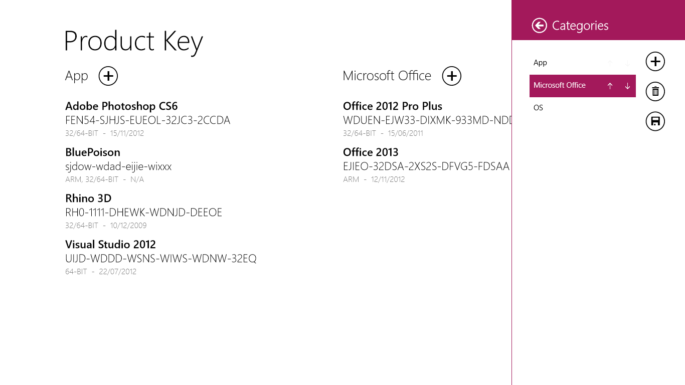 ProductKey stores the activation codes of operating systems and software that you purchased. It also allows you to create categories, store the product key by giving name, processor architecture and date of activation. The product keys are stored securely and encrypted in the memory of your computer.
