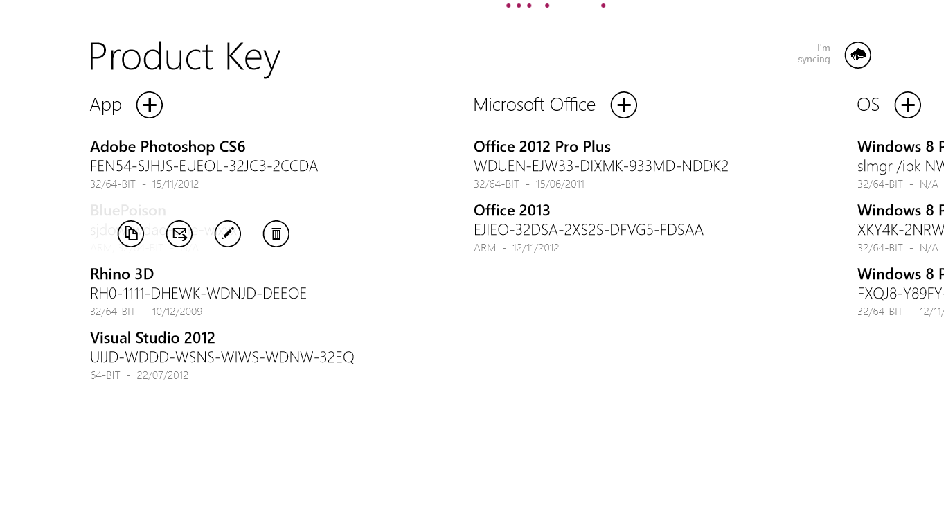 Saves the activation codes of operating systems and other software.Local data are encrypted and stored securely.Activation codes can be synchronized with other devices with Product Key installed.Also allows you to perform an online backup of your product key on Microsoft\'s secure servers.You can also set a password for application startup.