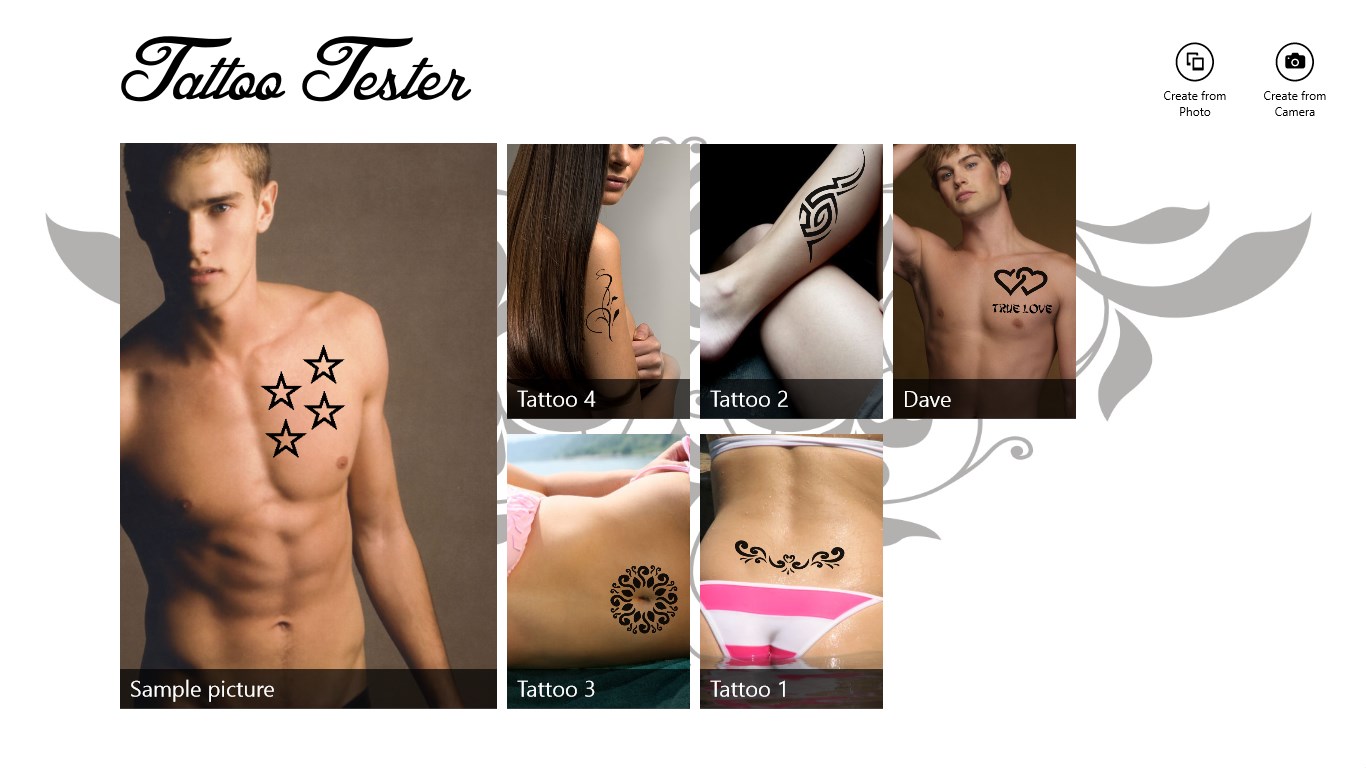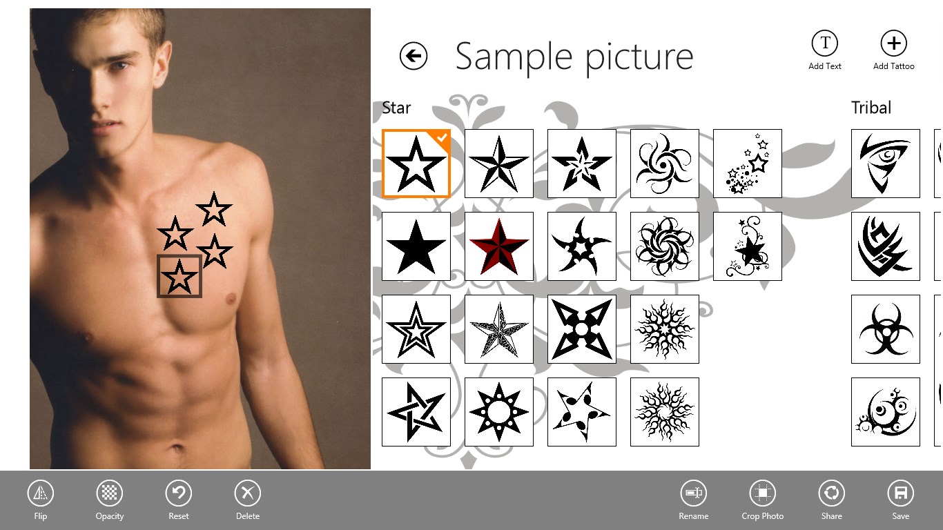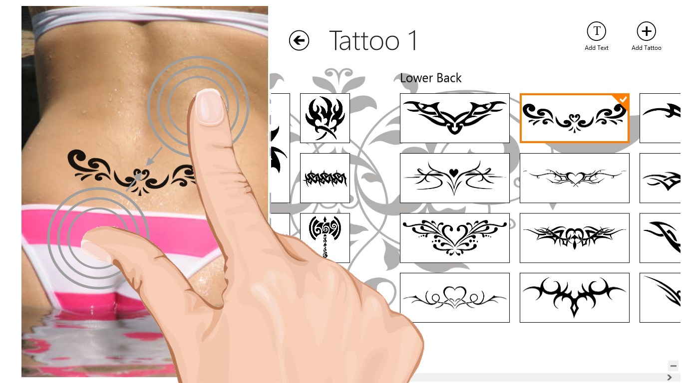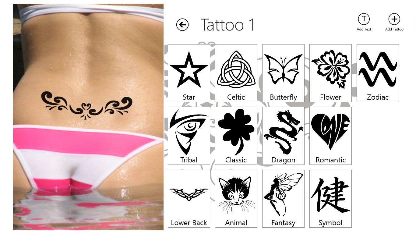 Choose from 402 tattoo designs in the categories: Star, Tribal, Lower Back, Abstract, Celtic, Classic, Animal, Butterfly, Dragon, Fantasy, Religious, Flower, Romantic, Tech, Symbol, Zodiac, SpiralThe first 5 tattoos from each categories are free. You can purchase all tattoos using an in-app purcahse.Add text in 8 different fontsFlip the tattoos or change the opacityShare your covers images using the Windows 8 Share CharmLive tiles showing your latest picturesPrint picture using the Devices charmFile Picker support
