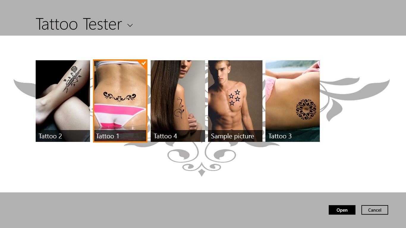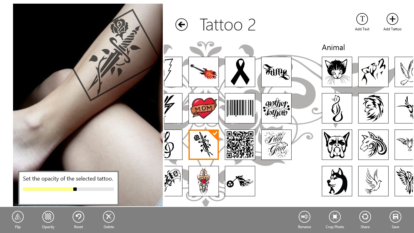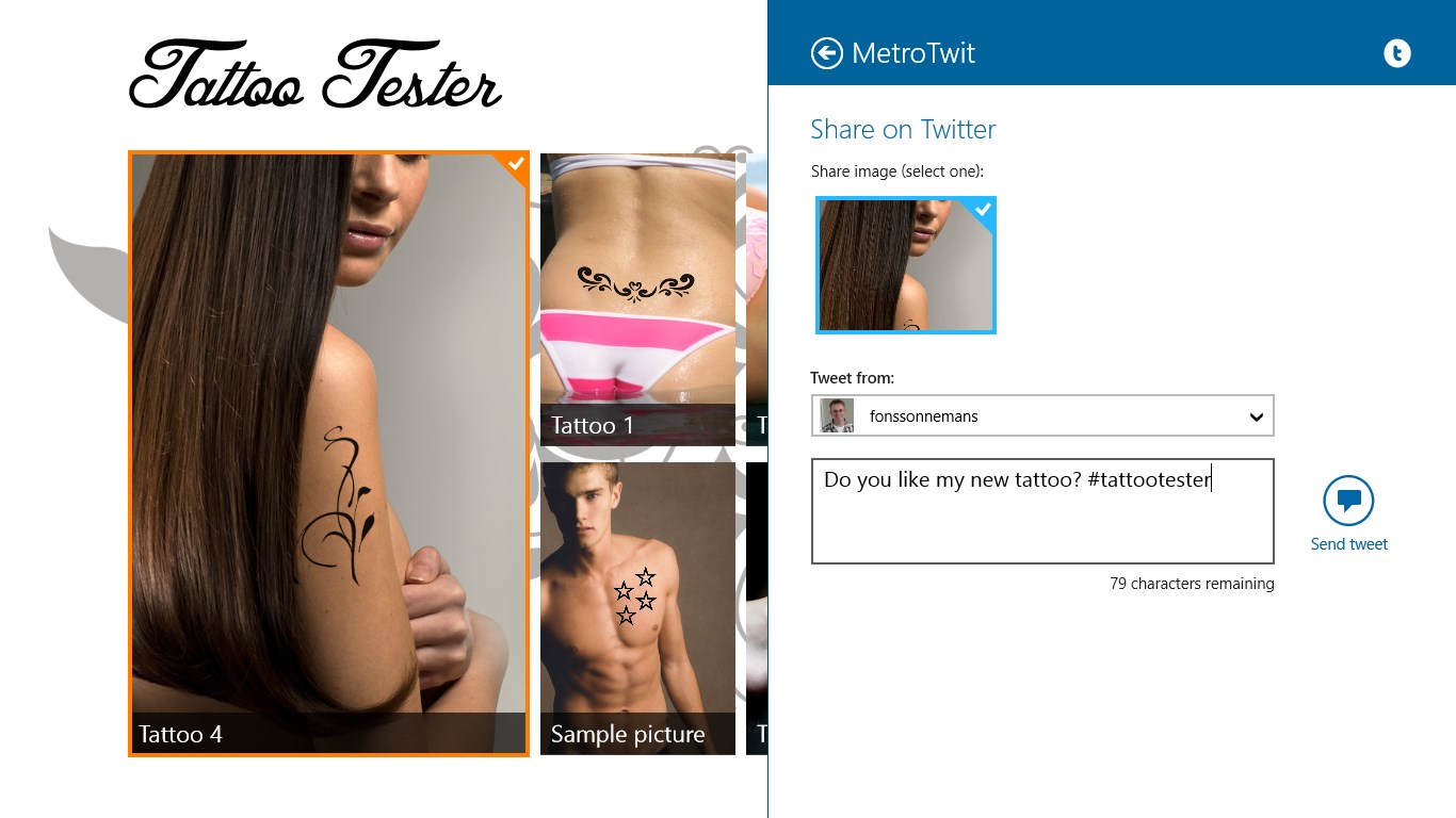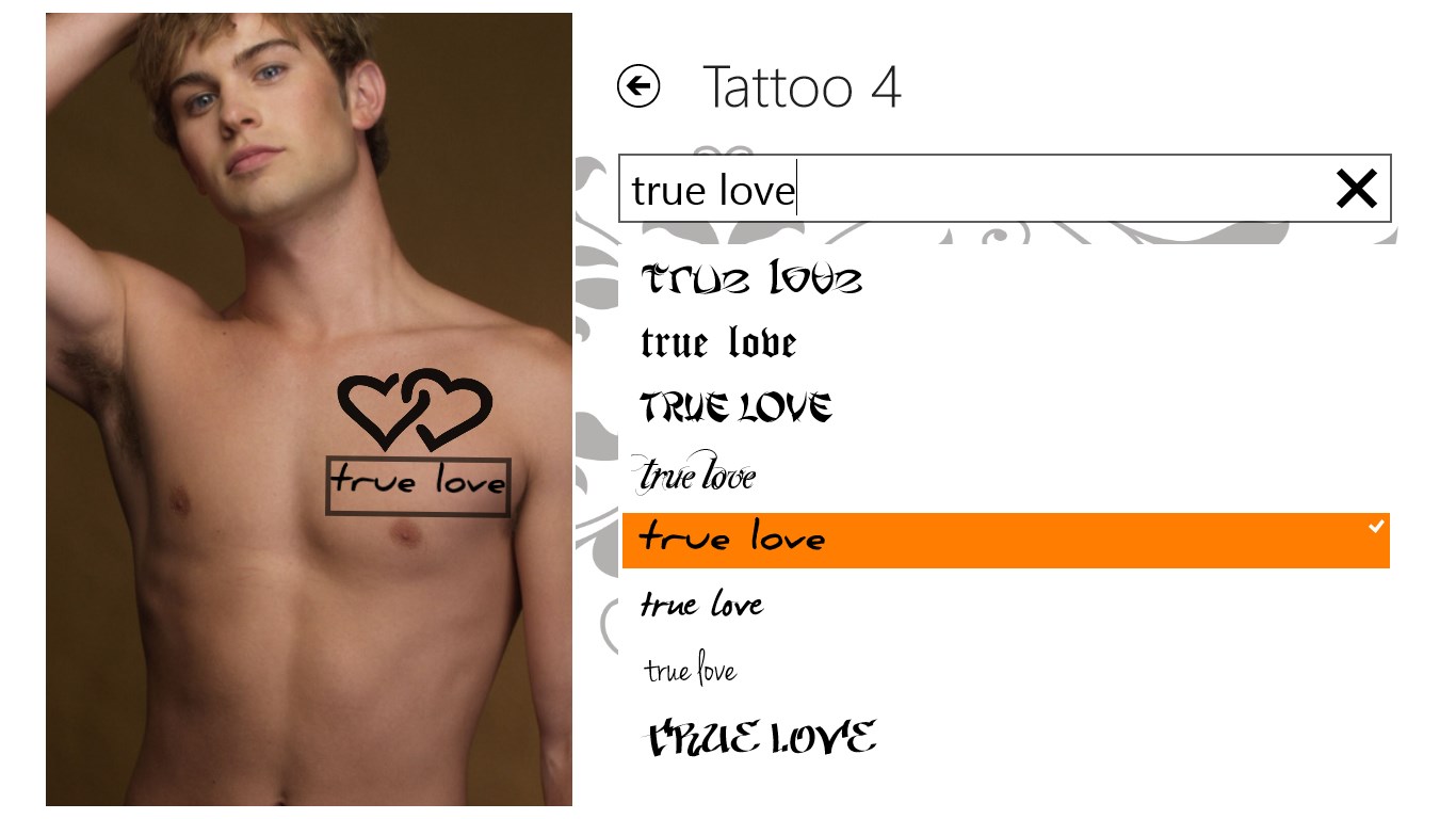 Choose from 402 tattoo designs in the categories: Star, Tribal, Lower Back, Abstract, Celtic, Classic, Animal, Butterfly, Dragon, Fantasy, Religious, Flower, Romantic, Tech, Symbol, Zodiac, SpiralThe first 5 tattoos from each categories are free. You can purchase all tattoos using an in-app purcahse.Add text in 8 different fontsFlip the tattoos or change the opacityShare your covers images using the Windows 8 Share CharmLive tiles showing your latest picturesPrint picture using the Devices charmFile Picker support