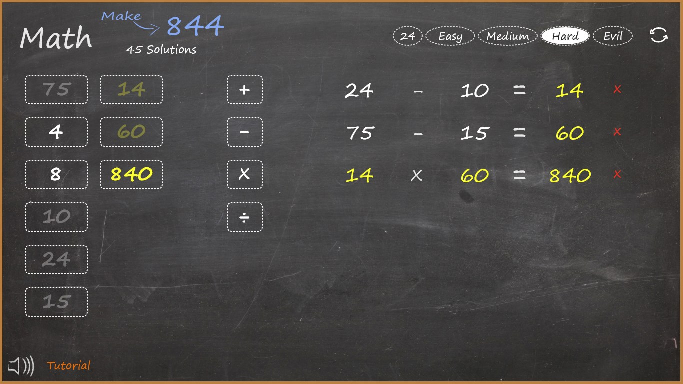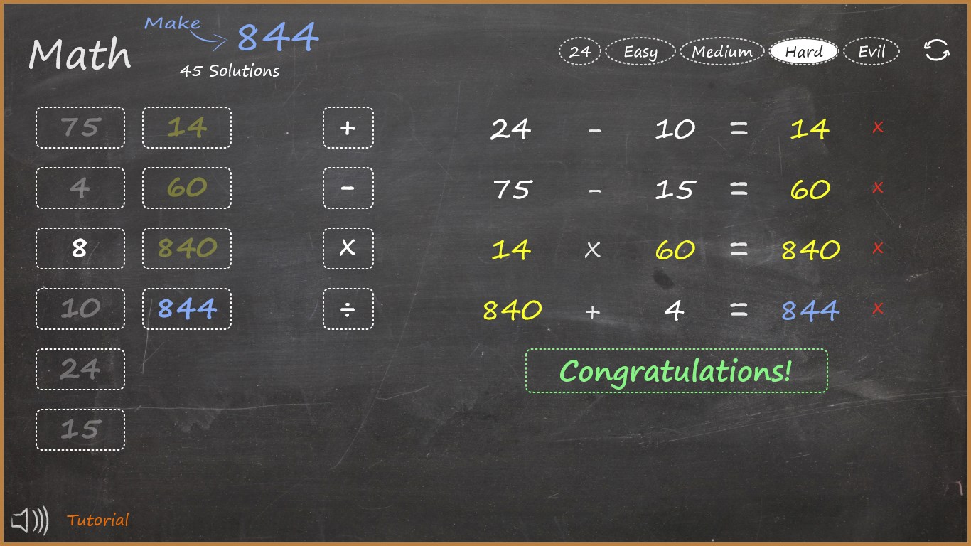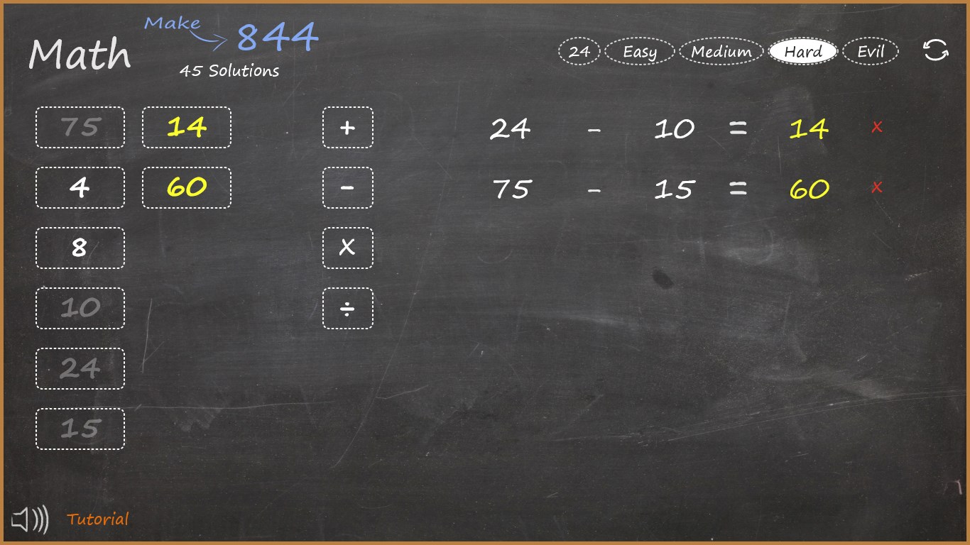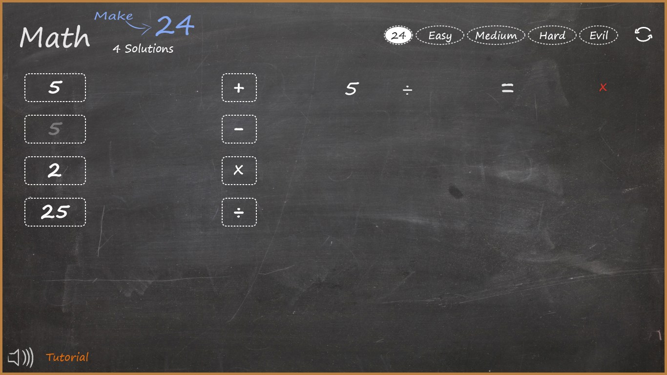 Five difficulty levels: 24, easy, medium, hard and evilAd-supported game in which you can remove the ad using an in-app purchaseTutorial modeMute sound effects