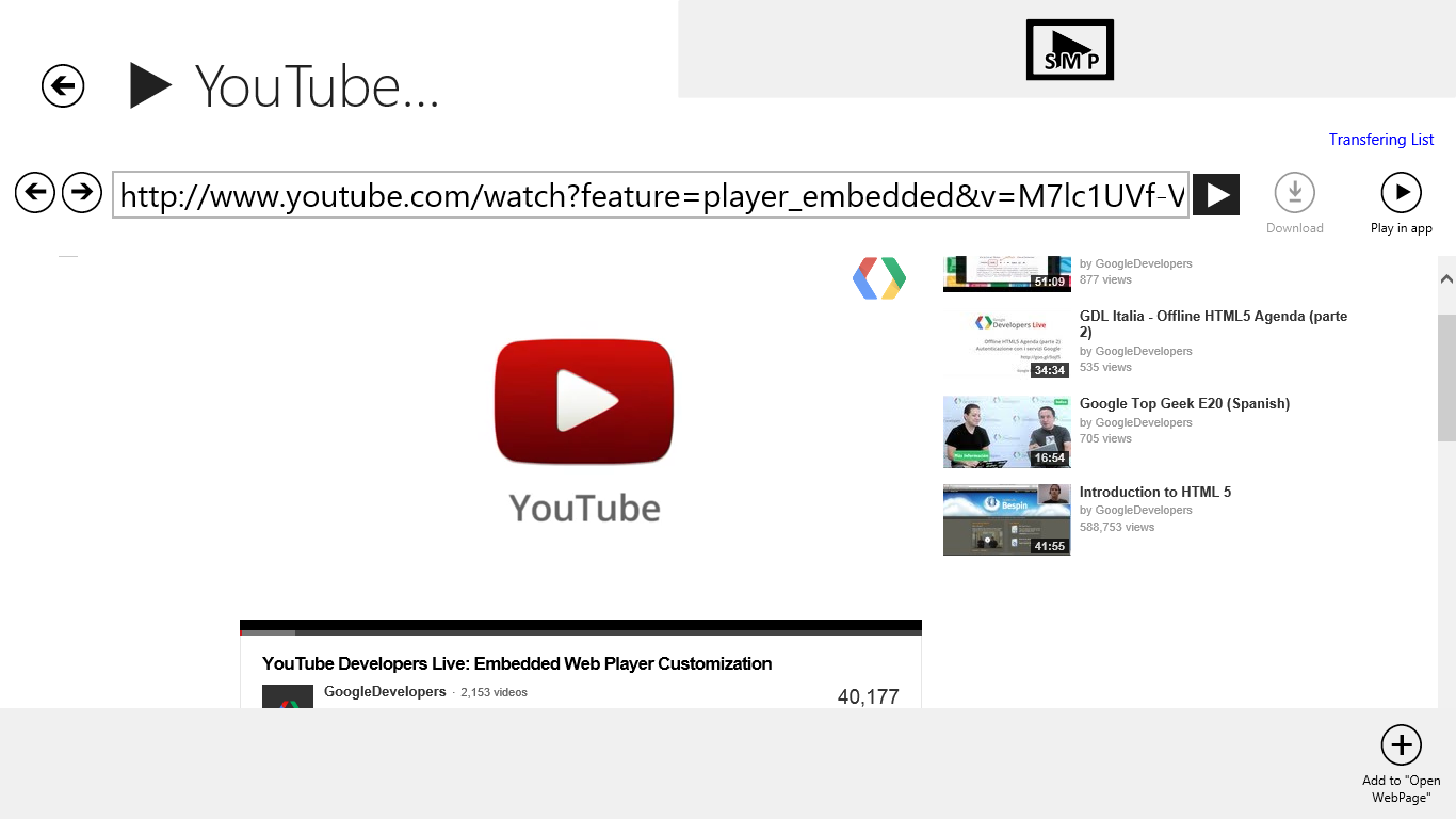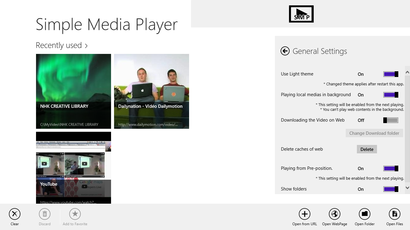 Simple operation (Just Selecting files, folder, web contents)Viewing the music files and movie files in the folder by full-screen and a list.Supporting "Open With".You can also select the file from other app. (Ex. SkyDrive)When playing local files, You can play files in background.When playing local files, you can do "Random play" in the folder.When playing local files, you can do "Play to" from "Devices Contract".When playing local files, you can show a list of the playing.When playing local files, you can sort a list of the playing by drag & drop.When playing local files, you can zoom movie by scrolling mouse wheel, pinch-in and pinch-out.When playing local files that have some audio tracks, you can change the audio track.You can call app by URI scheme (smp://). You can also use the bookmarklet.You can select UI theme from "Settings Contract". (Light or Dark)You can streaming video playback from the common sites supporting HTML5 video. (v10.1.2-)You can download video from the common sites supporting HTML5 video. (v10.2.1-)When playing local files, you can switch the videos by gesture. (v10.2.7-)Linking to "Simple niconico Player".(v10.4.4-, Simple niconico Player v1.0.2-)