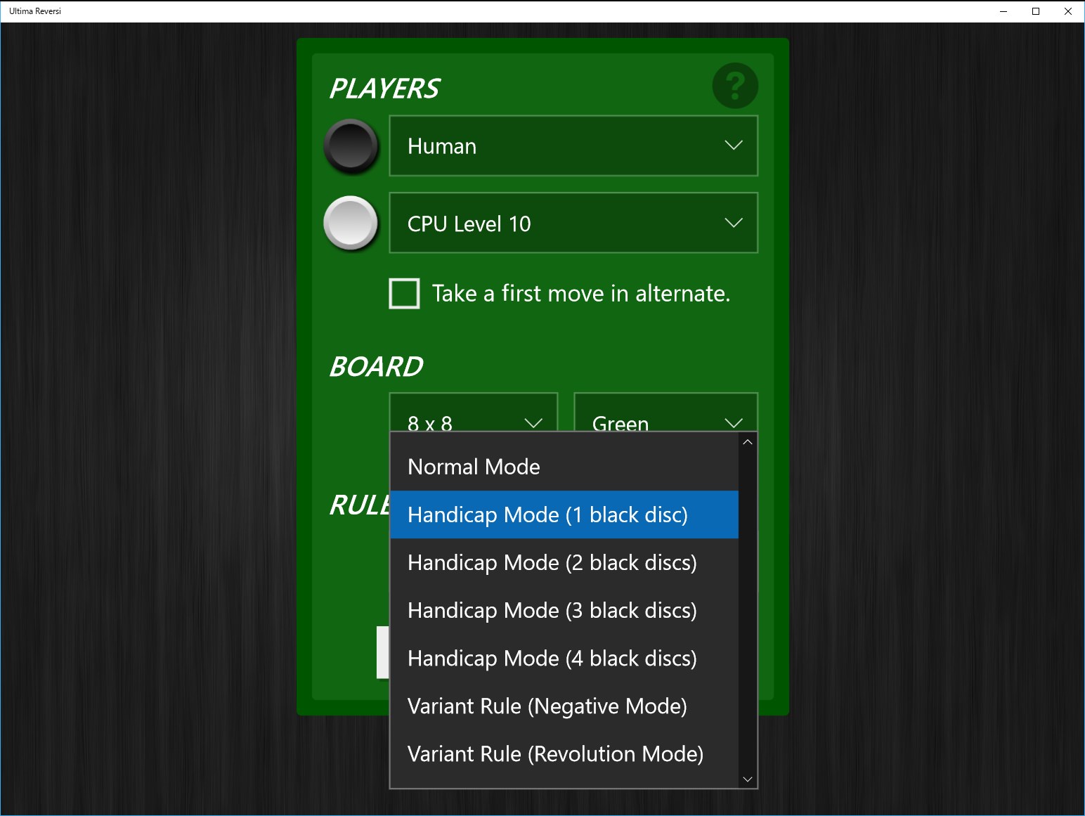 1-player mode (Human vs CPU).2-players mode (Human vs Human).Watching mode (CPU vs CPU).10 levels of difficulty.Scoreboard and rating system.Various board size (4x4, 5x5, 6x6, 7x7, 8x8, 9x9, 10x10) and various board color.Various rules (normal mode, 4 stage handicap modes and 2 variant modes).Supported undo and hint functions.Other various options (CPU Level Auto-matching, Alternate first move, etc.)