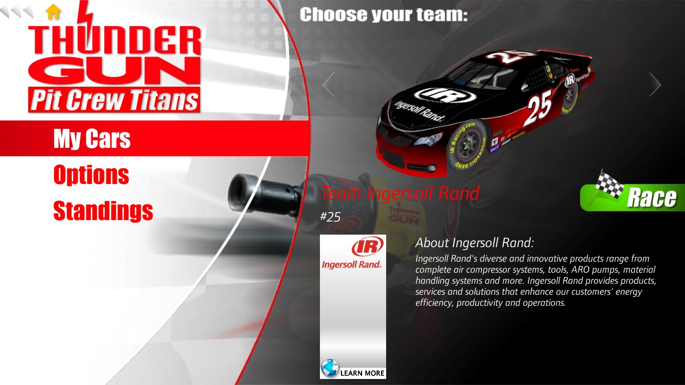 Thunder Gun Pit Crew Titans by Ingersoll Rand puts you in control of an 8-man pit crew to see how fast you can get your car in and out of the pits and back on the track for victory. Get ready to refuel the tank, pump the jack, and work those lug nuts with an Ingersoll Rand Thunder Gun, just like the real pit crews who have been using Ingersoll Rand tools in the pits for over 50 years! Challenge yourself to perfect your pit stop and compete with friends and players around the world for the best time.