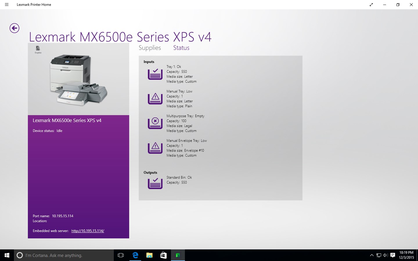 Configure advanced Lexmark printer settings directly from Windows Store appsCheck the status of printers associated with the app to quickly resolve any warningsMonitor supply levels, like toner and paper