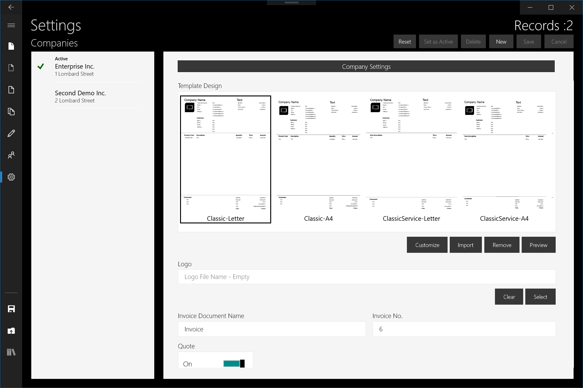 When you are ready to use Invoice 360 for your company, please use the Settings -> Reset function to remove the demo data. With the demo data removed, you can easily change the Company Name and Invoice Number.
