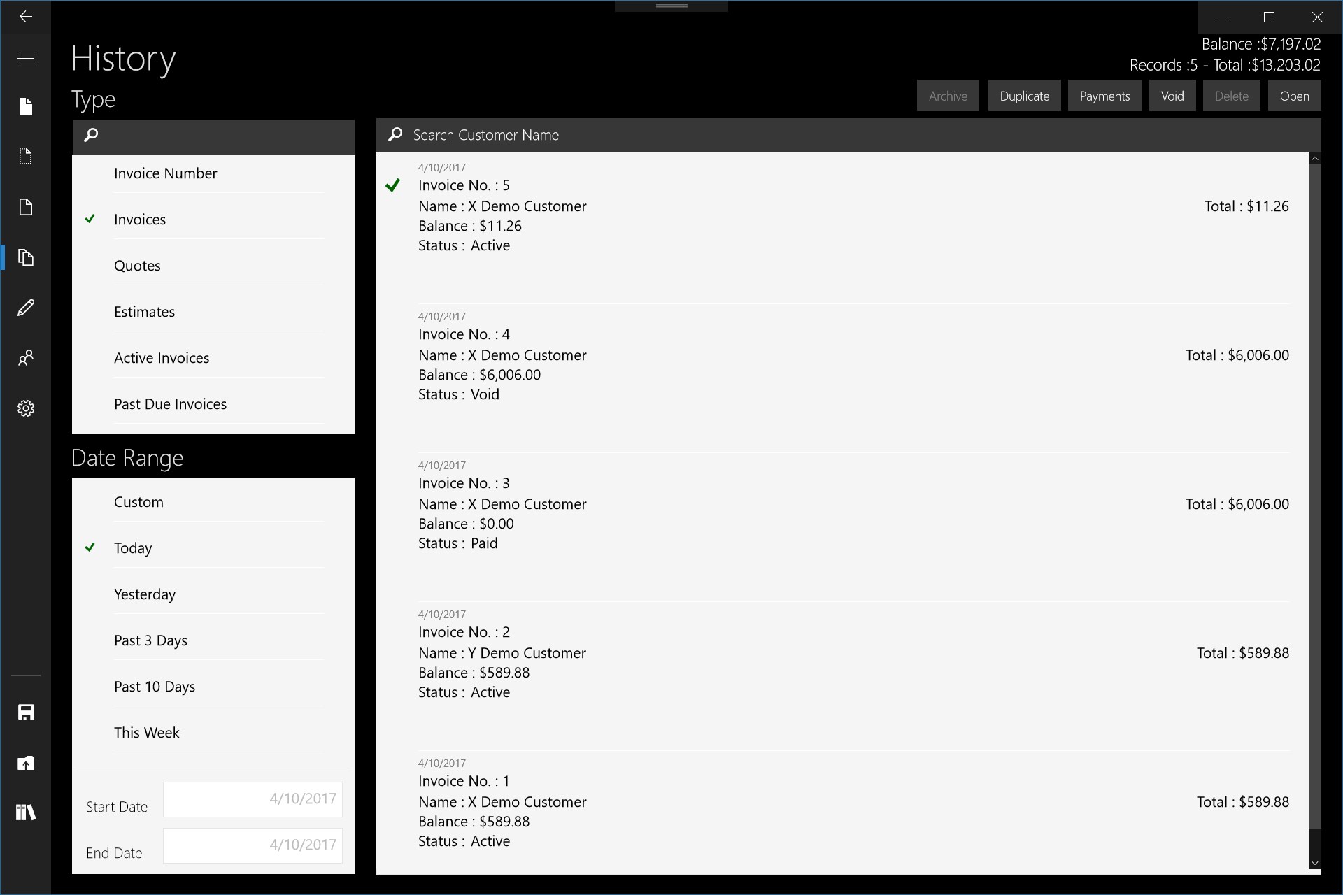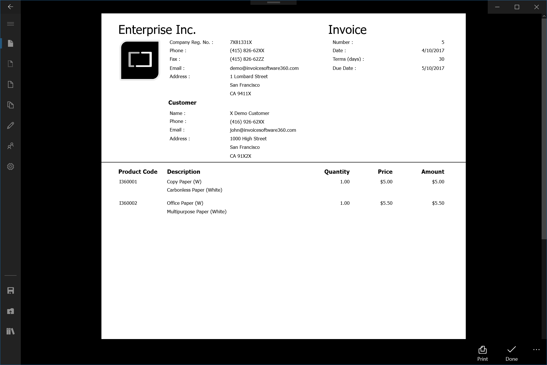 For accounting purposes, many customers require an electronic copy of the invoice. The PDF format, being the most ubiquitous and flexible format, is selected as the document electronic format. We have chosen to build an in-app PDF engine that enables you to load new invoice templates and generate PDF invoices without additional third-party PDF printer drivers or plugins.