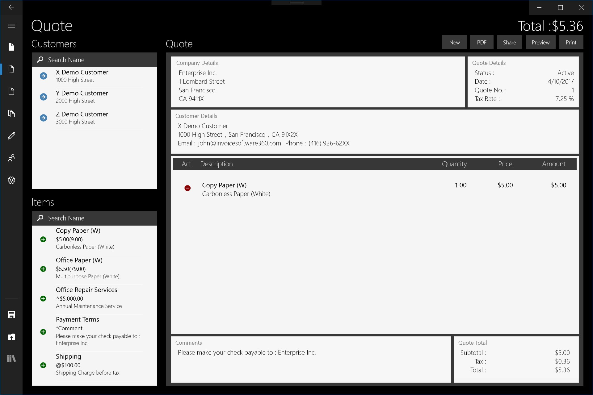 Create Invoices, Quotes and EstimatesPreview, Print, Share and PDF Invoices, Quotes and EstimatesCustomize Invoice TemplatesManage Payments, Inventory, Customers and Settings