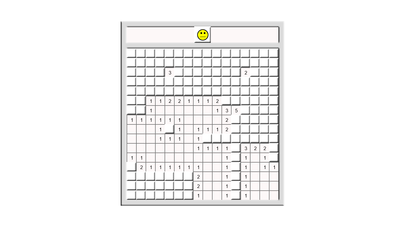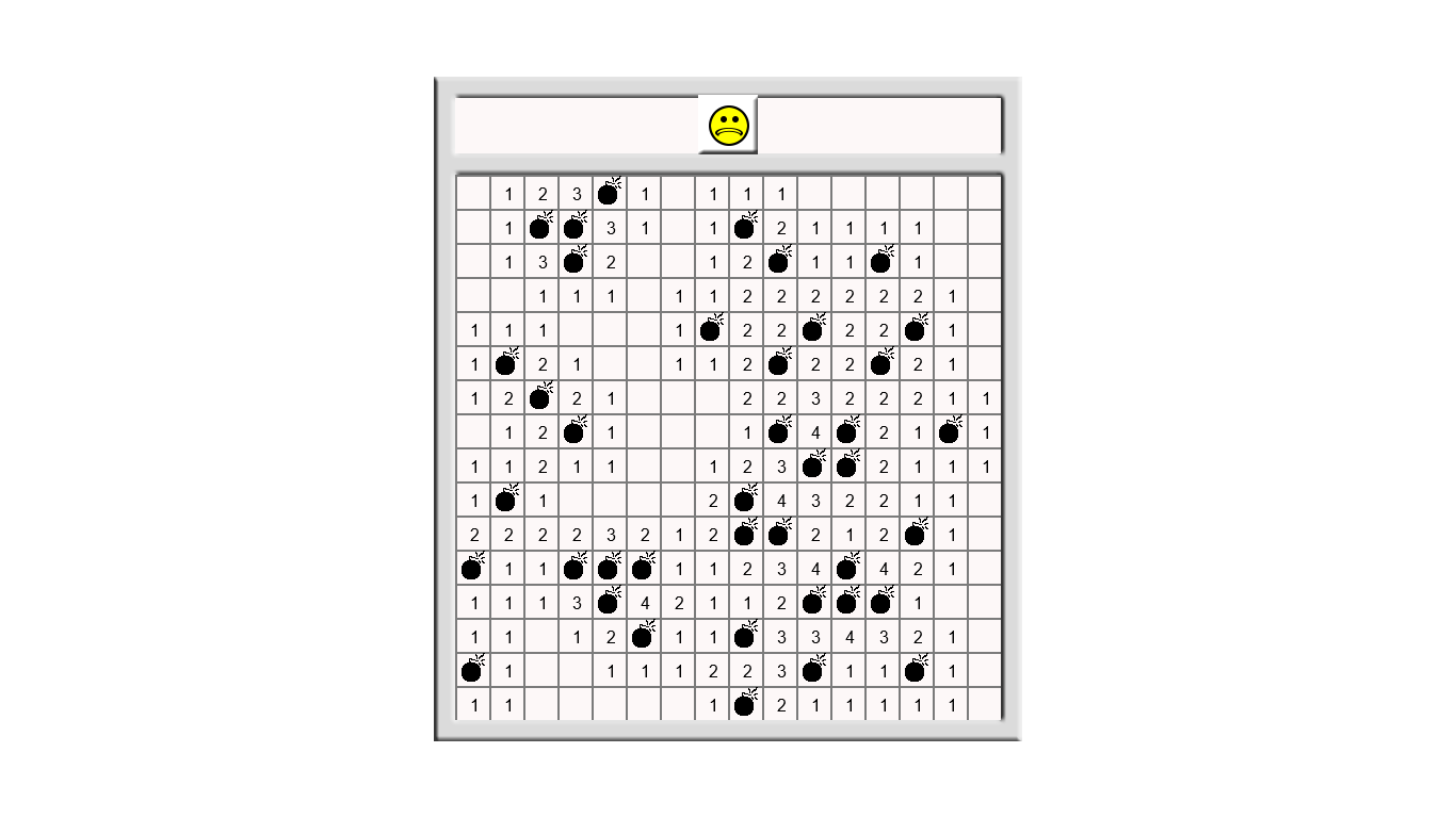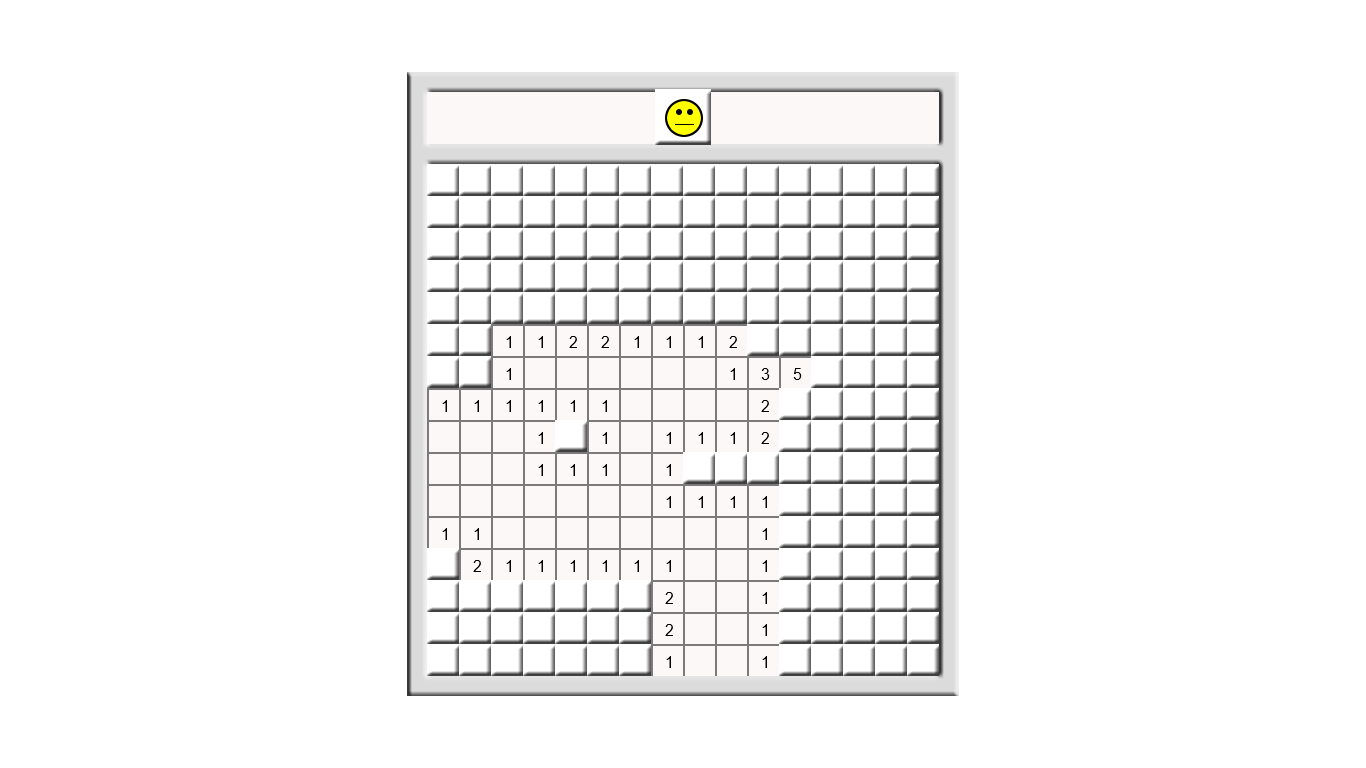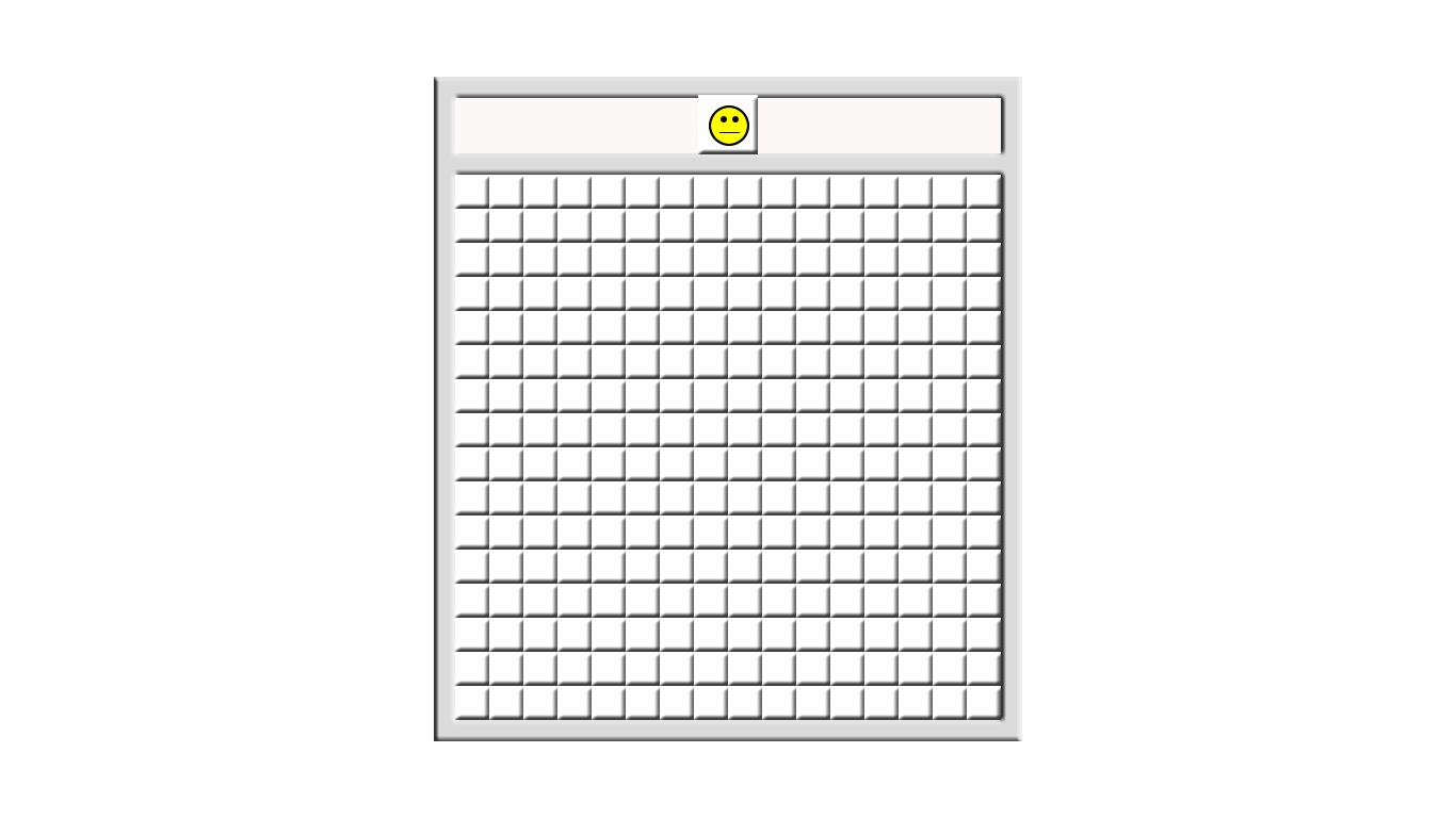 Diffusing a field of landmines by clicking on safe squares which reveal how many landmines you are touching. For example, if you click on an "3" then that square has three landmines touching it. Challenge yourself to clear all squares without touching any mines. Click yellow face to restart new game.