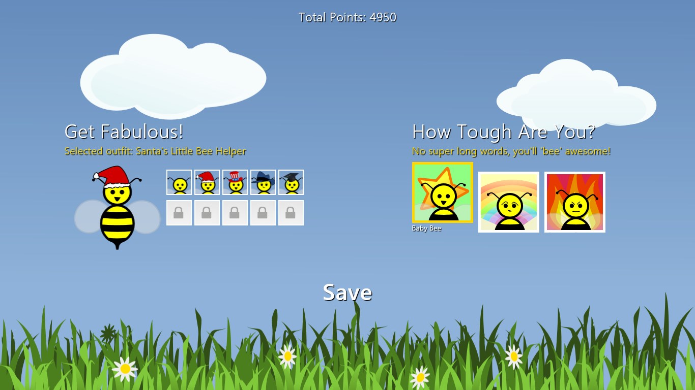 Over 200 level themes such as: words that contain \'cow\' or \'moo\'!10 different outfits to unlock so you can \'bee\' fabulous!3 difficulty levels so everyone can \'bee\' awesome at it!