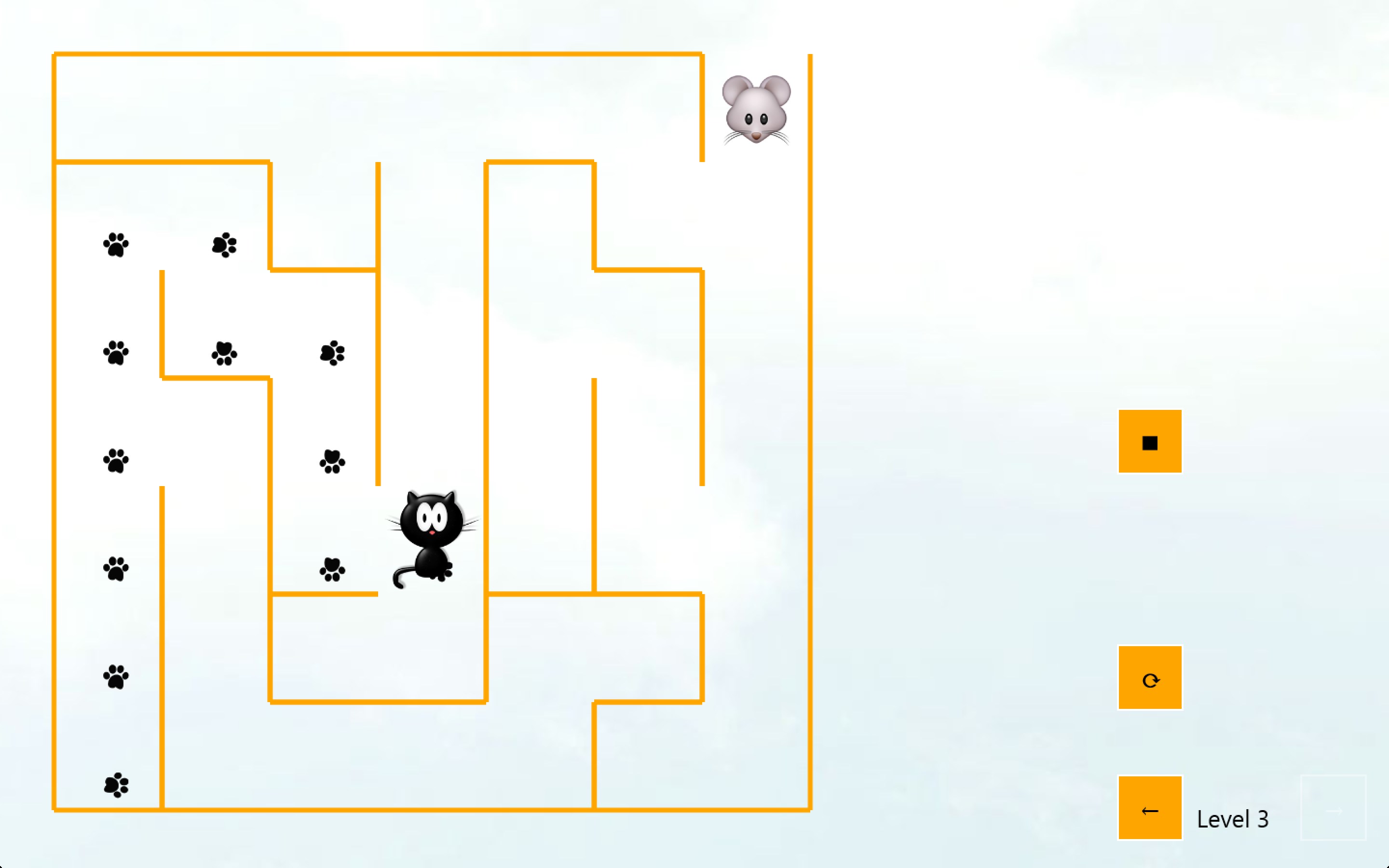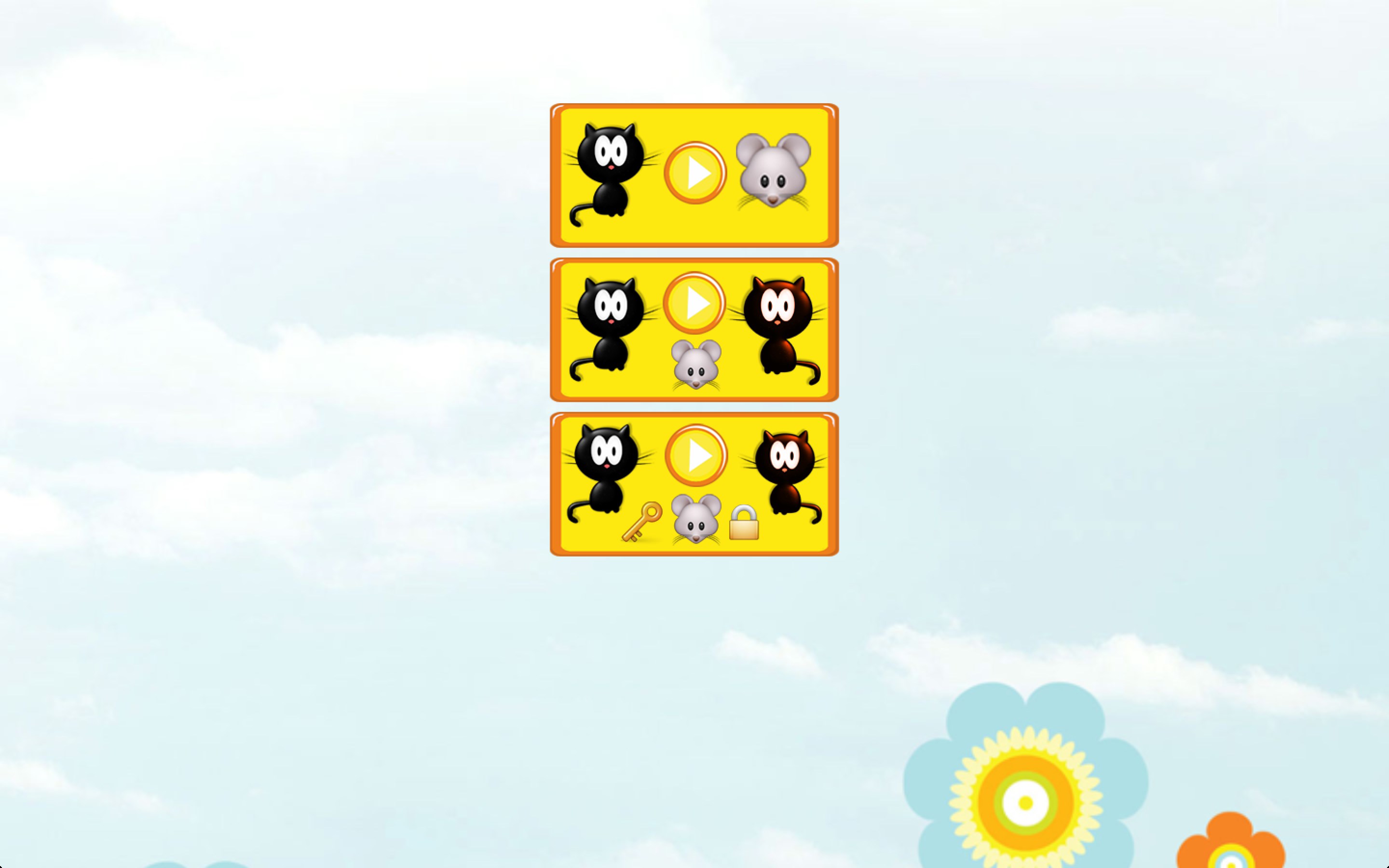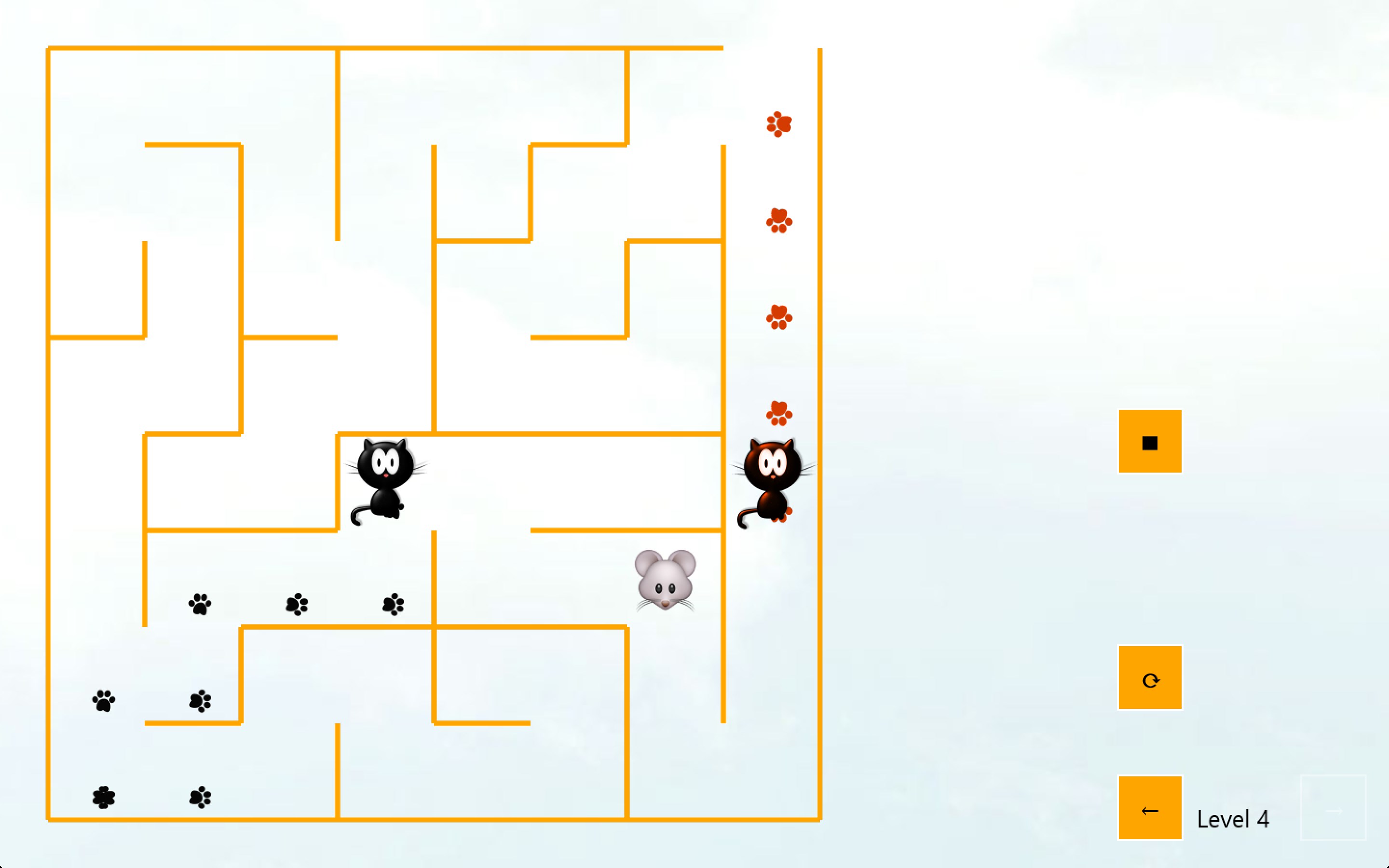 Challenging mazes: after solving a maze a more complex maze will be unlockedChallenge against another cat: be faster than the cat and get to the mouse first.
