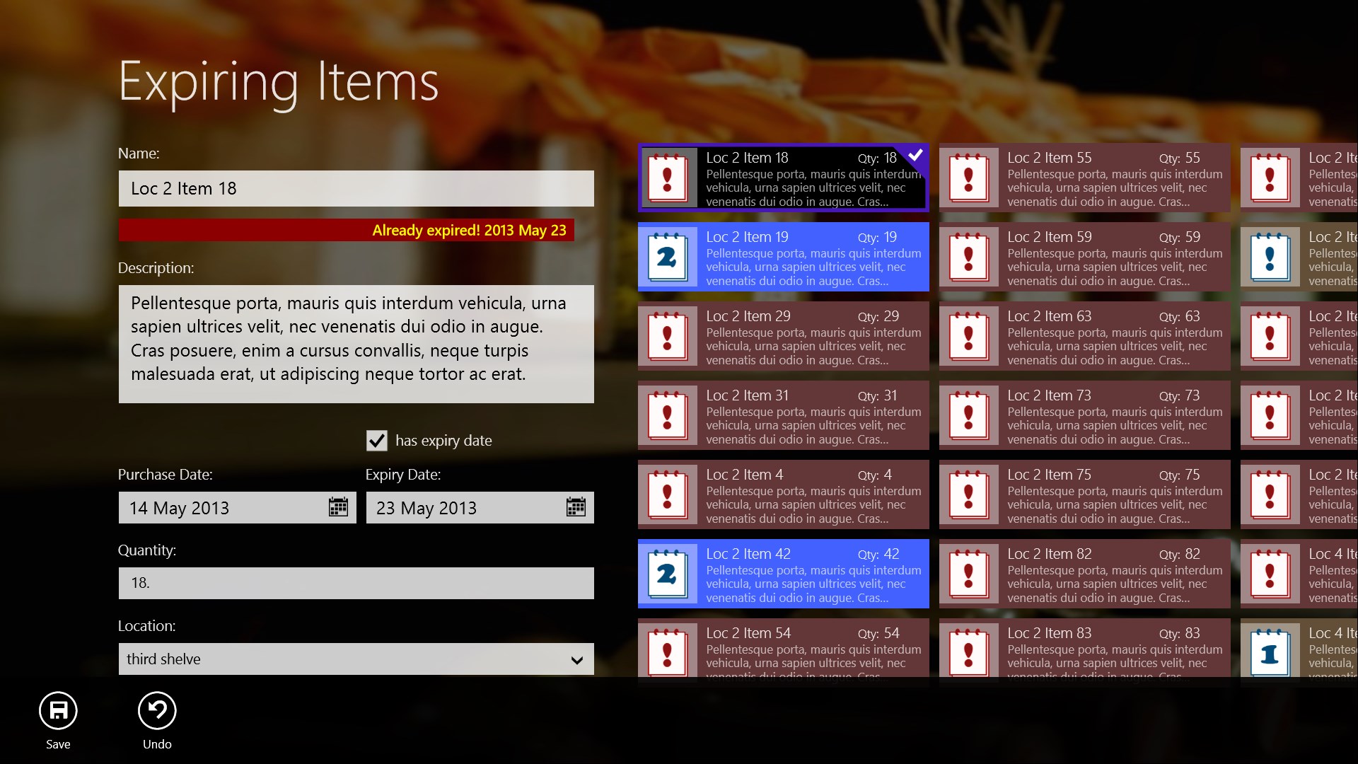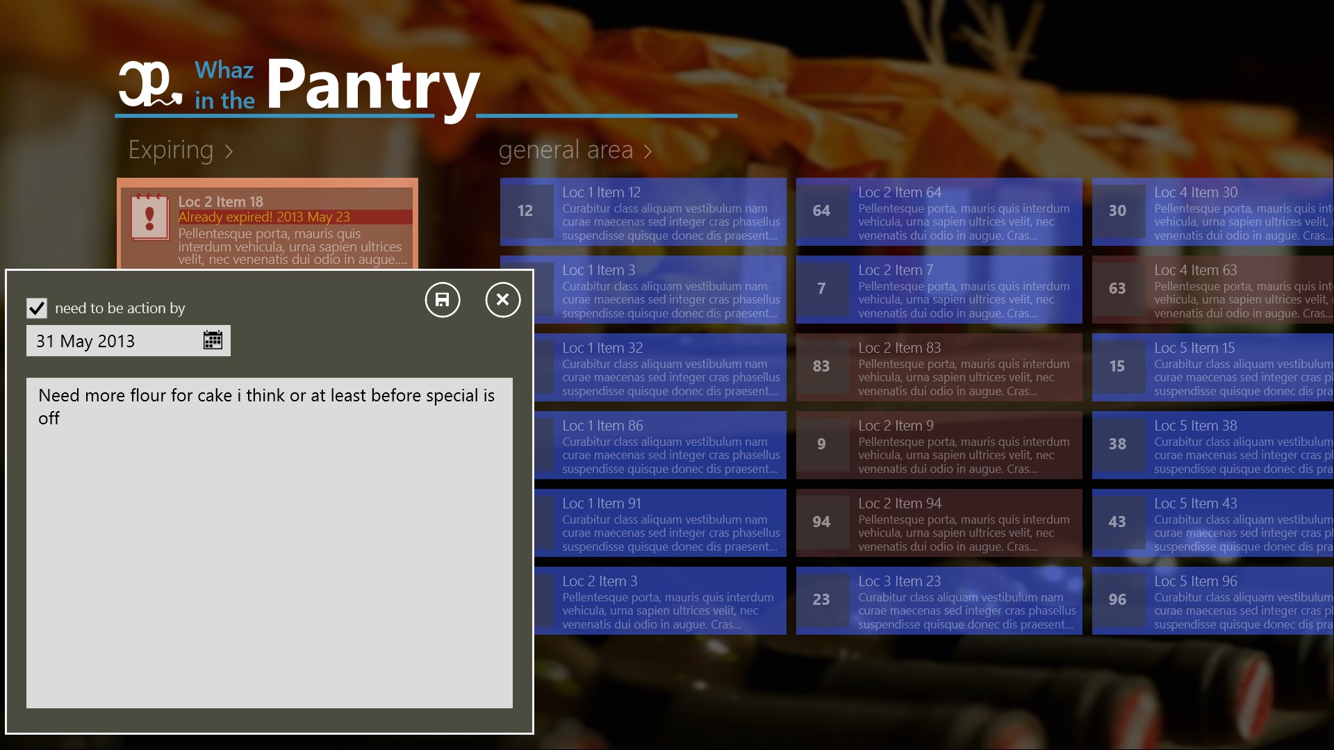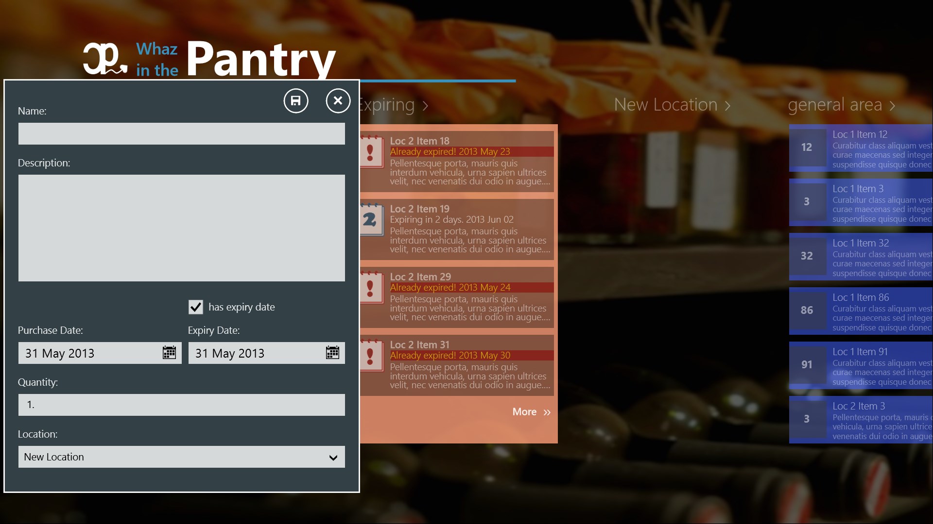 Did you even wonder how many stuff in the pantry that you have forgotten, you can't remember if you have already brought it but you buy some more just in case? This is the app for you, its a simple app that will be an aid to you by keeping track of all the cans, packages, etc from getting wasted.