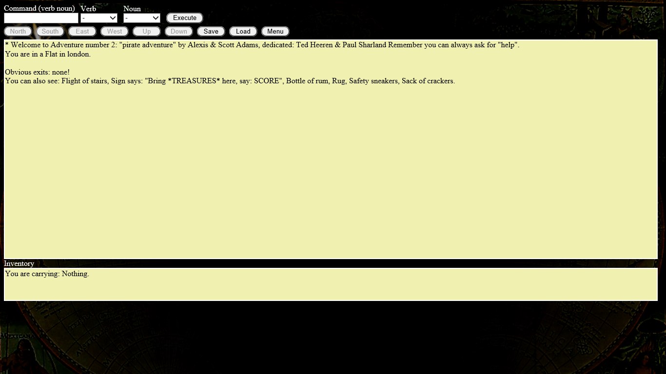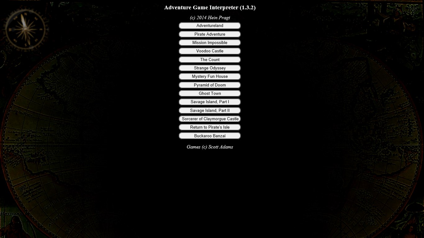 This is a Scott Adams adventure game interpreter program, it was originally written in 1997 and ported to HTML5/CSS/Javascript in 2014 by Hein Pragt from the Netherlands. I included the original game data files, (with permission of Scott Adams). The user interface has buttons for common command, a separate inventory window, and drop-down list with all nouns and verbs. This makes it easier to play, because in the old versions the game was more like guess the keywords. This version makes it easier to play the games with a more modern and user friendly user interface. I created this program "just for fun" because sometimes you need to do something to enjoy programming without any commercial use. I enjoyed programming this interpreter and playing the old games, I hope you will enjoy playing these games as well.