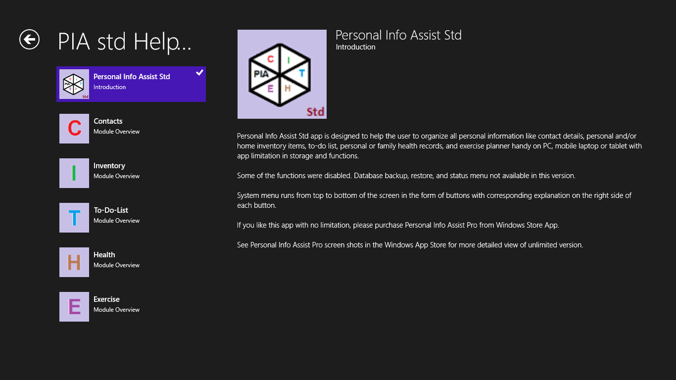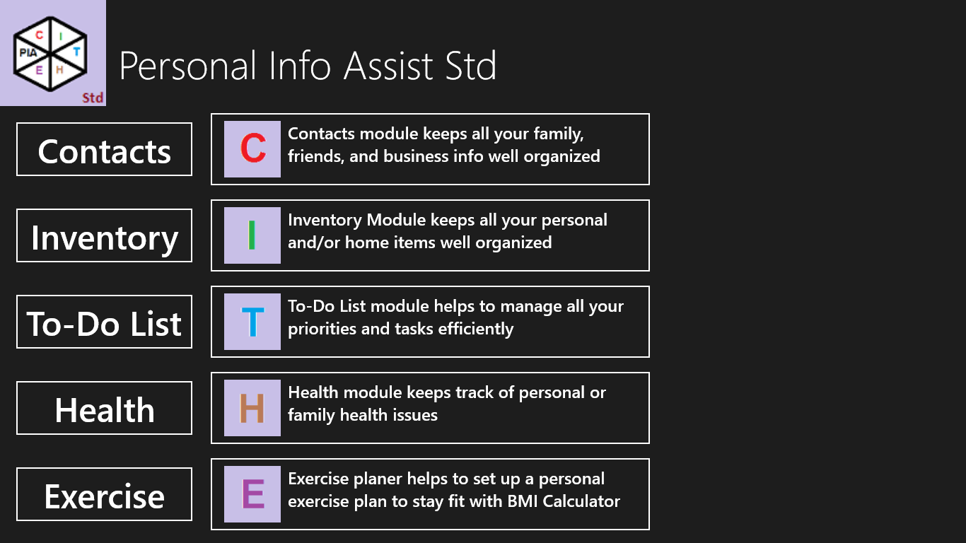Personal Info Assist Std app is designed to help the user to organize all personal information like contact details, personal and/or home inventory items, to-do list, personal or family health records, and exercise planner handy on PC, mobile laptop or tablet with app limitation in storage and functions. If you like the app, please purchase Personal Info Assist Pro version which is unlimited and fully functional.