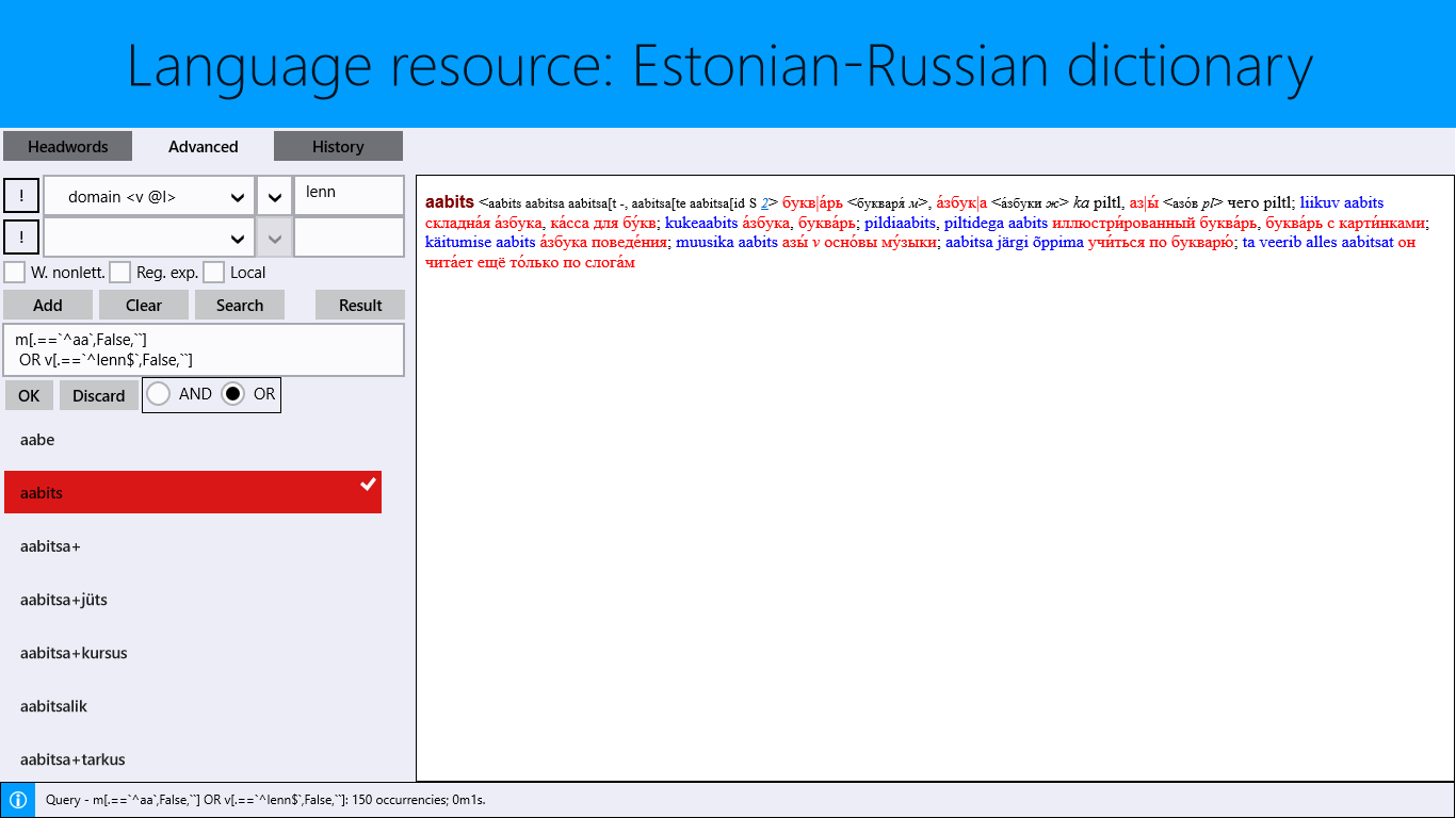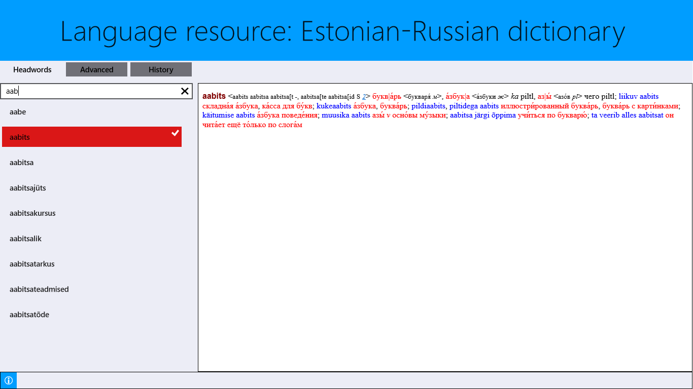 Estonian-Russian dictionary. Saves history of the viewed articles. Works also with Windows built-in search. Advanced search enables search on all article attributes. Detailed instructions for using product on the Help page. Live tiles present headwords and their equivalents.