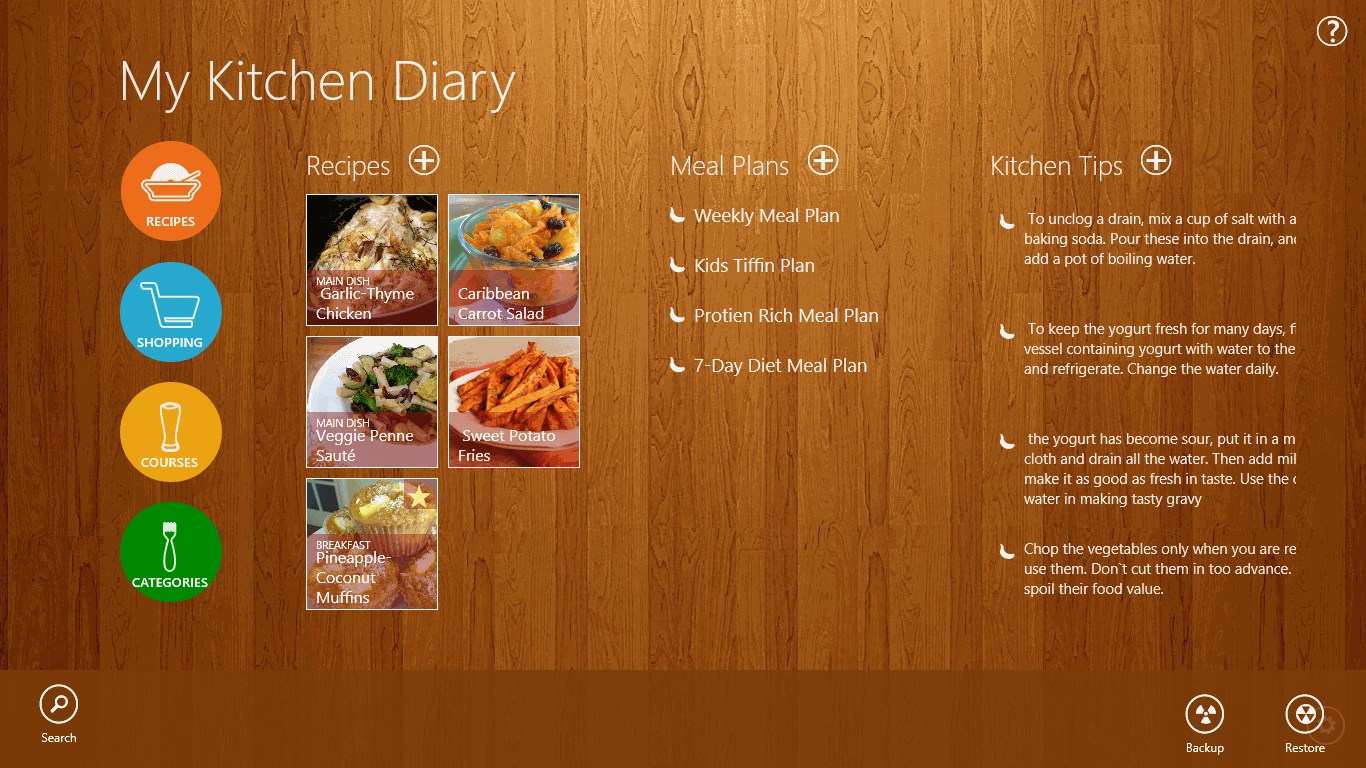 Manage your recipe collection with auto-complete for ingredientsSave favourites recipesTag and categorize recipesShare recipesMeal plan calendar - Plan your meals using recipes from your own collectionSave diiferent meal plans like protien meal plan, diet meal plan, weekly meal plan etc.Create grocery lists for shopping using auto-complete for grocery itemsExport grocery lists as PDF and shareList out Kitchen tips and save it and search for them as and when required.Backup your recipe data on skydirveRestore your backup