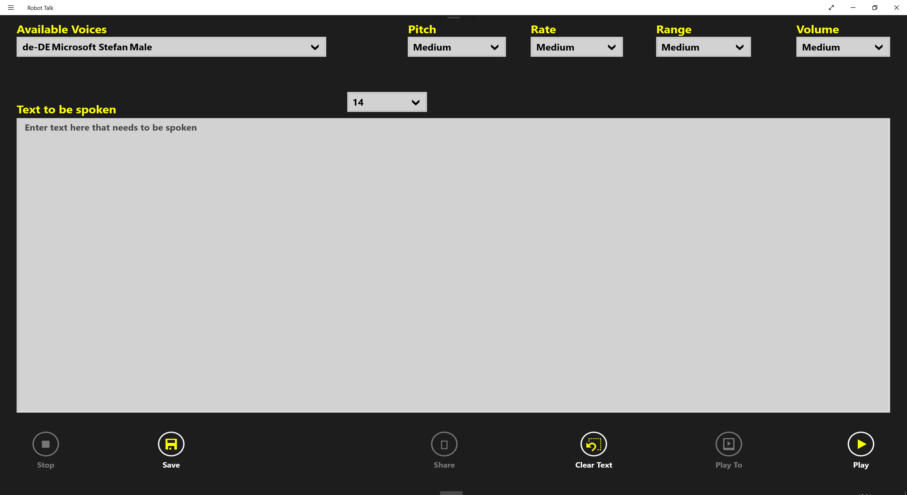 Share saved audio with others via the share featurePlay speech to another dlna-enabled device using Playto featureSave speech to either wav/wma/mp3 audio file formatChange voice/pitch/rate/range/volume of speech