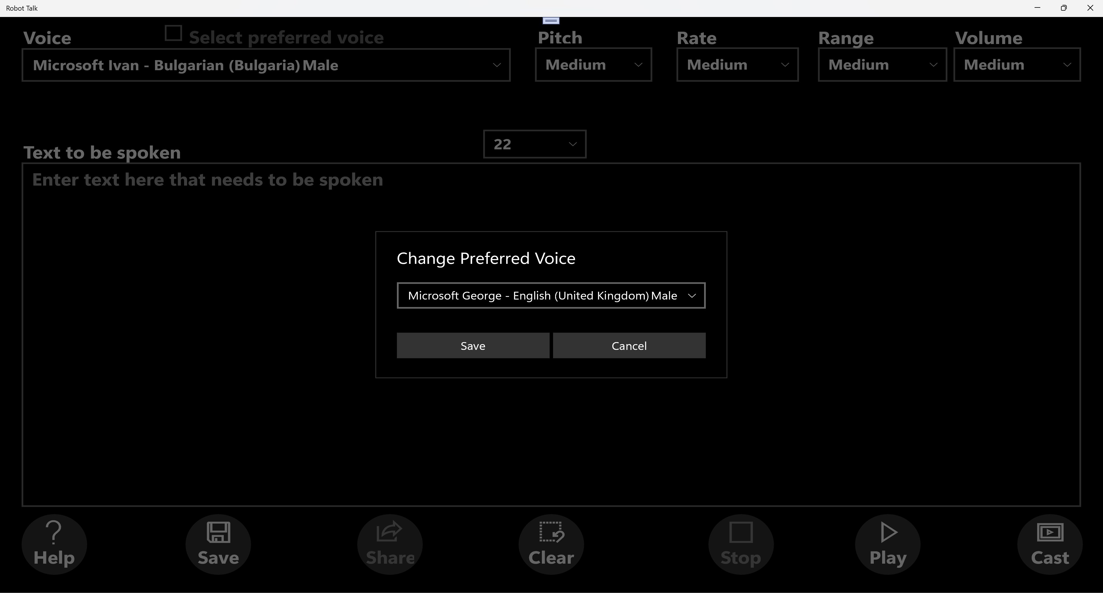The change preferred voice screen on first load selects your default voice as the selected option. This you can change to any other available voice before saving. Once saved you can use your preferred voice, by checking the option above the voices dropbox on the main screen.