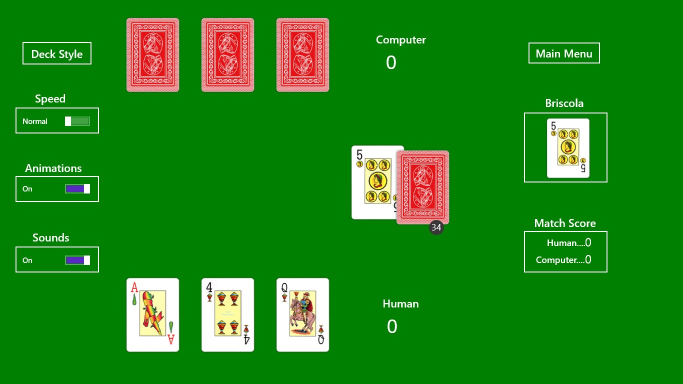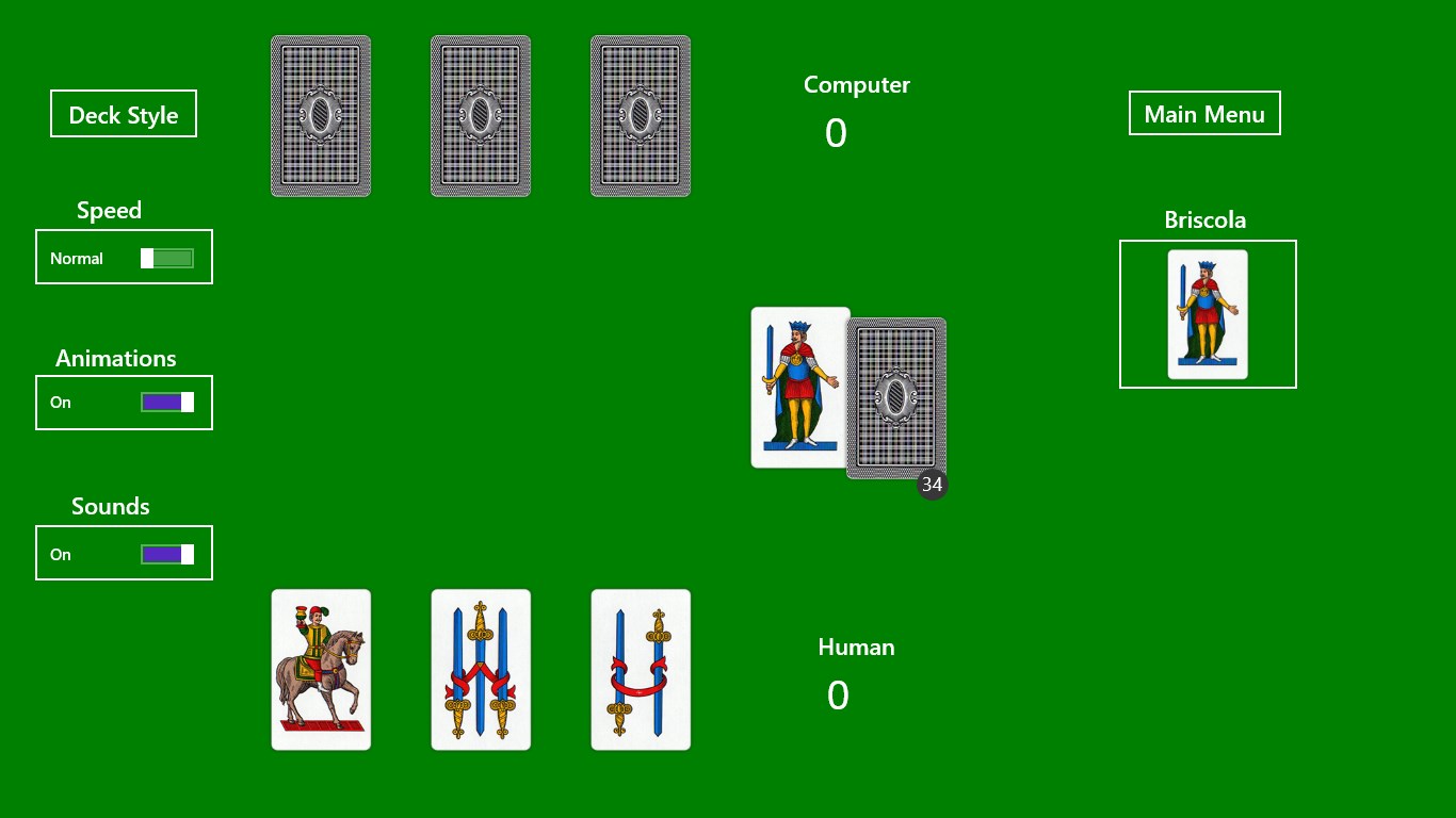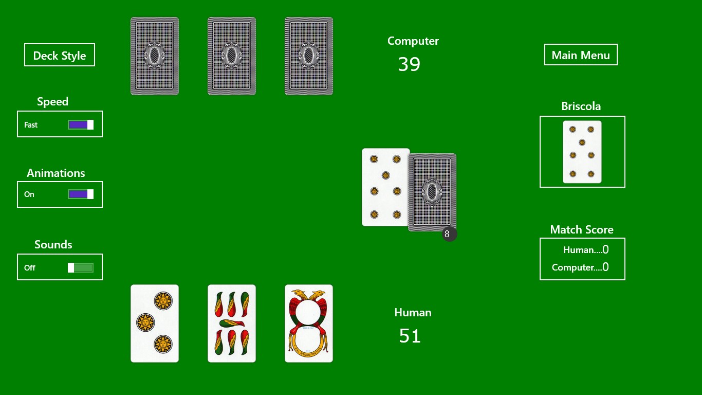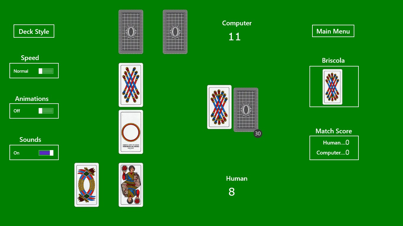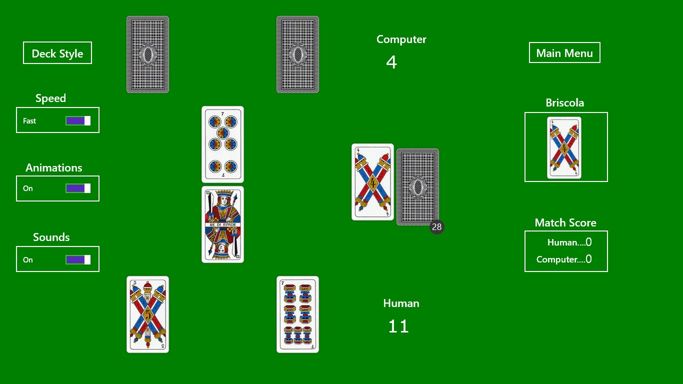 A one player game of Briscola. Features 2 different modes. A Single Game Mode and a best of 7 Match Mode.