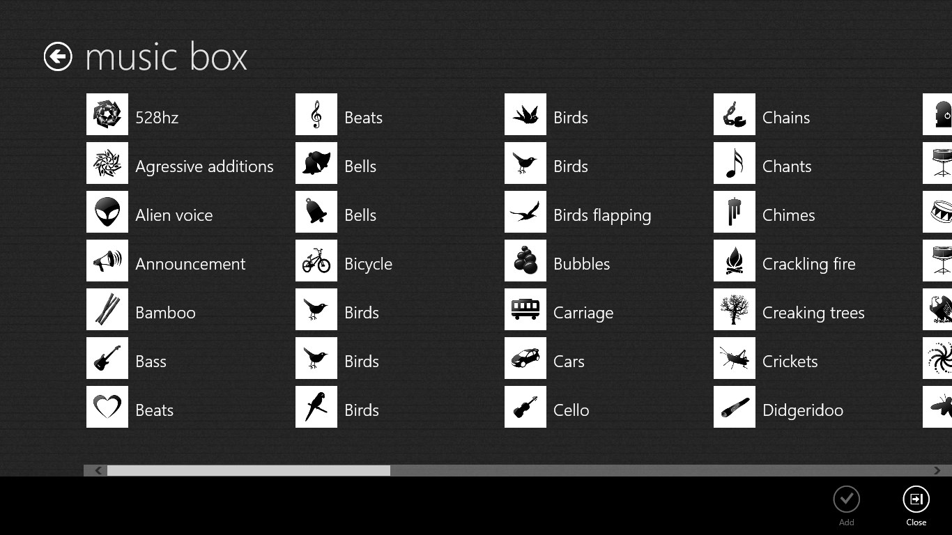 24 quality scenes for free each with multiple sound effects to choose fromSleep timerNo adsIndividual volume control for each sound effect (Windows)Background audio support so you can use other apps while listening (Windows)Customize scenes with your favorite sound effects (Windows)