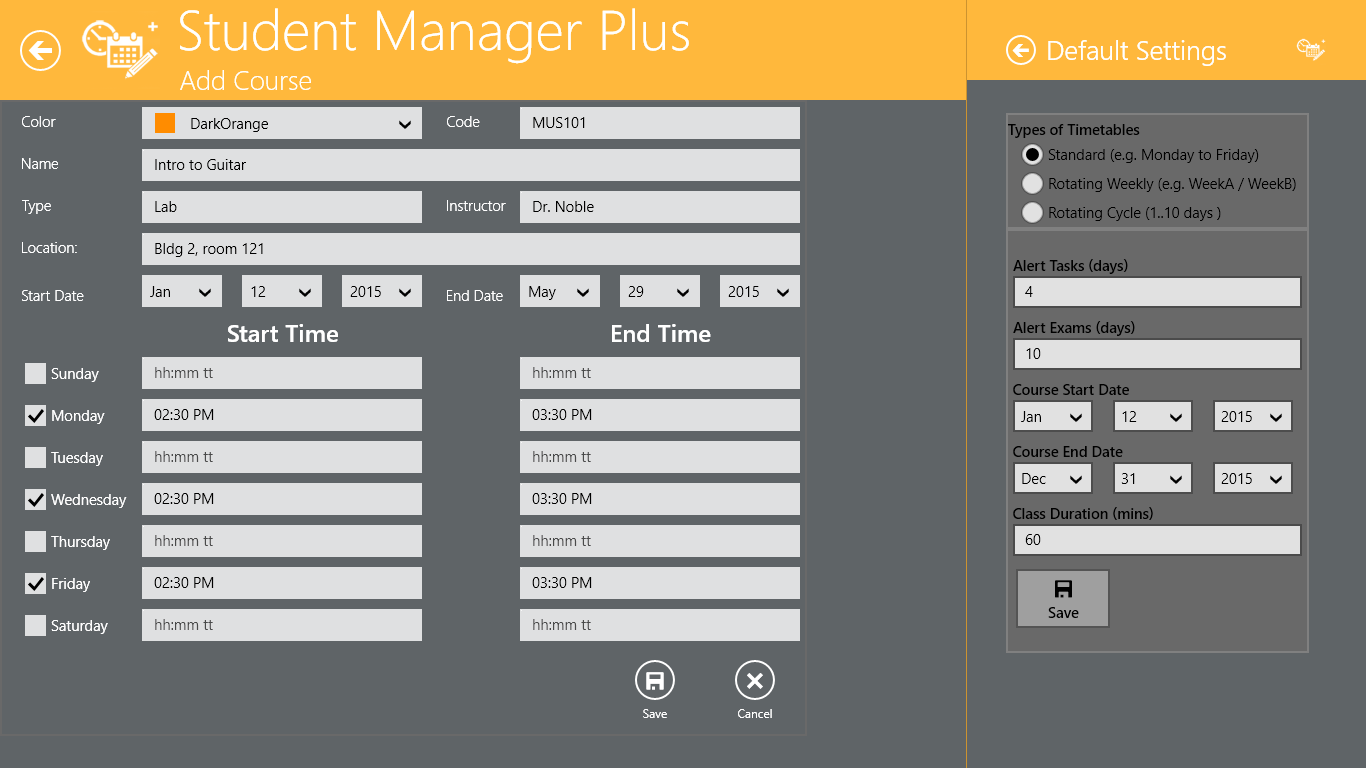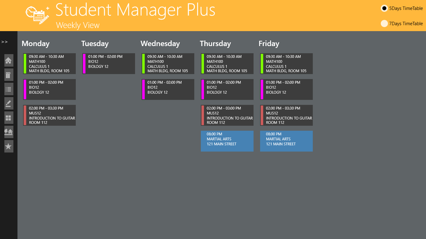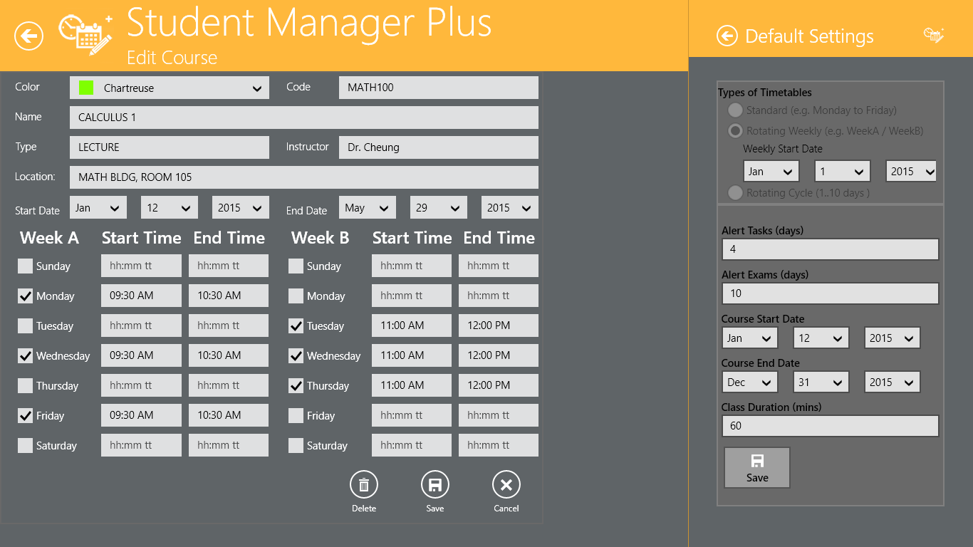 Set your Timetable Type, Task and Exam alert preferences, and default Course settings.An automatic daily dashboard view of your Courses, Tasks and Exams.Grab a sneak peak of your future daily dashboard views, including Events and Holidays to help you plan ahead, or look back at previous days.View your weekly timetable of Courses by day in either a 5 days or 7 days format.Manage your Courses, Tasks and Exams through easy to use search, add, edit and delete functions.Monitor and predict your grade standing for each course based on grade distribution criteria.A Help Guide including notes and tips.