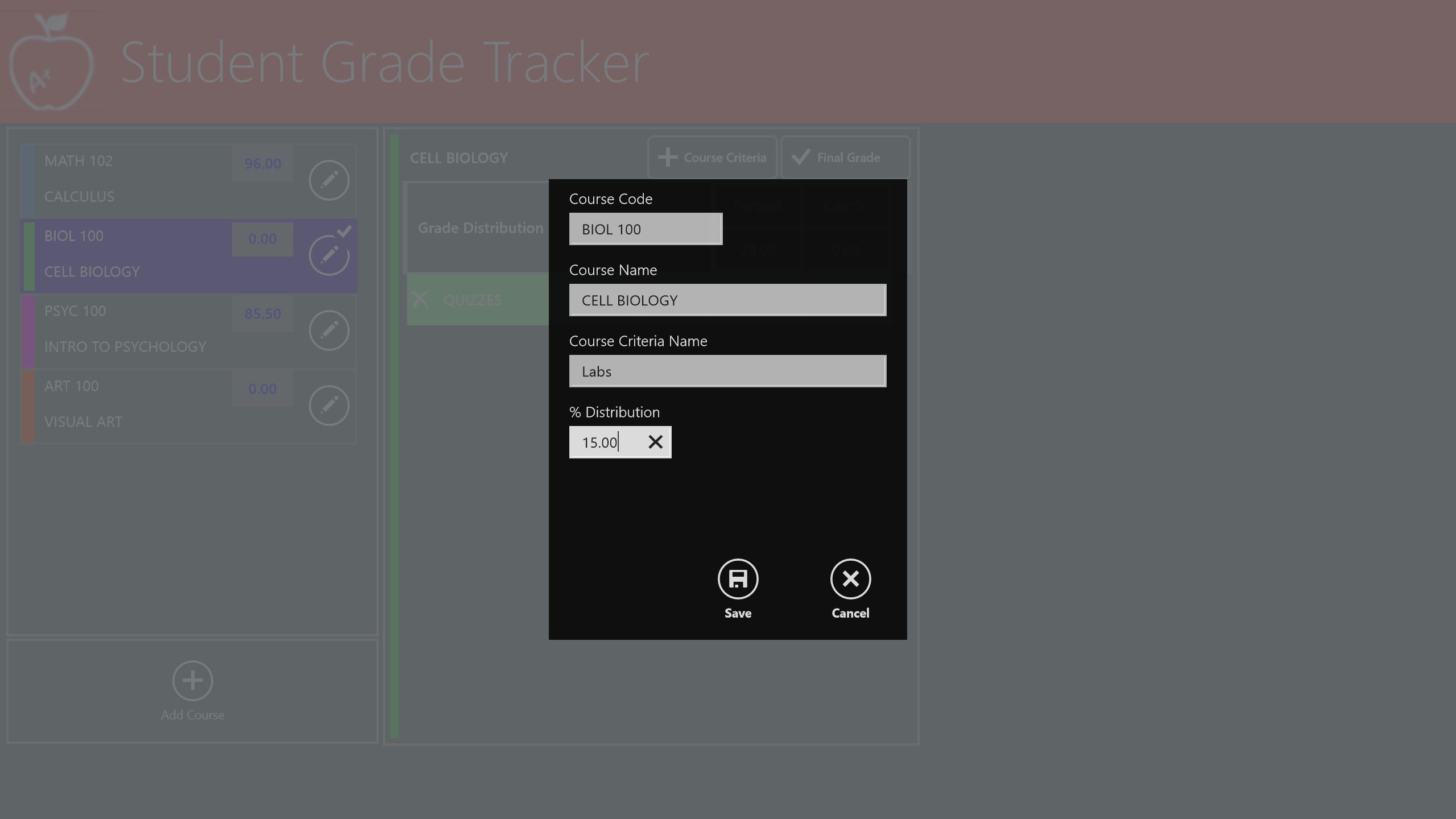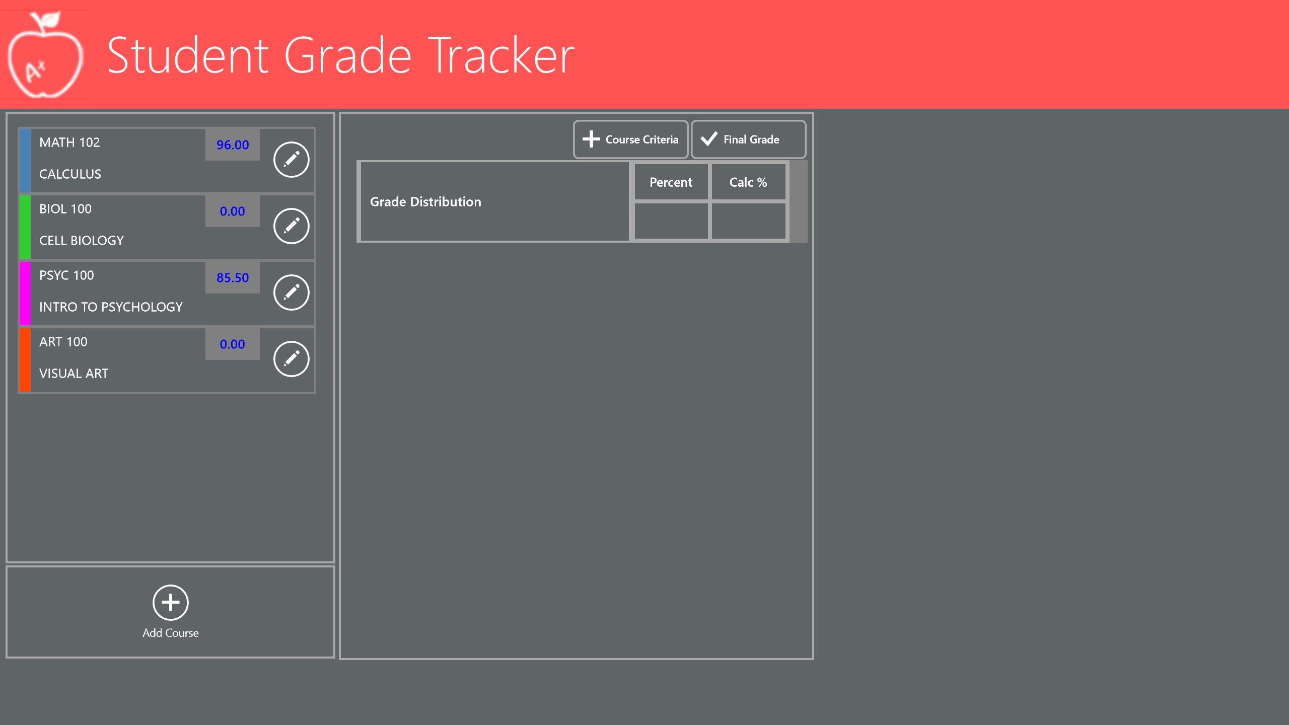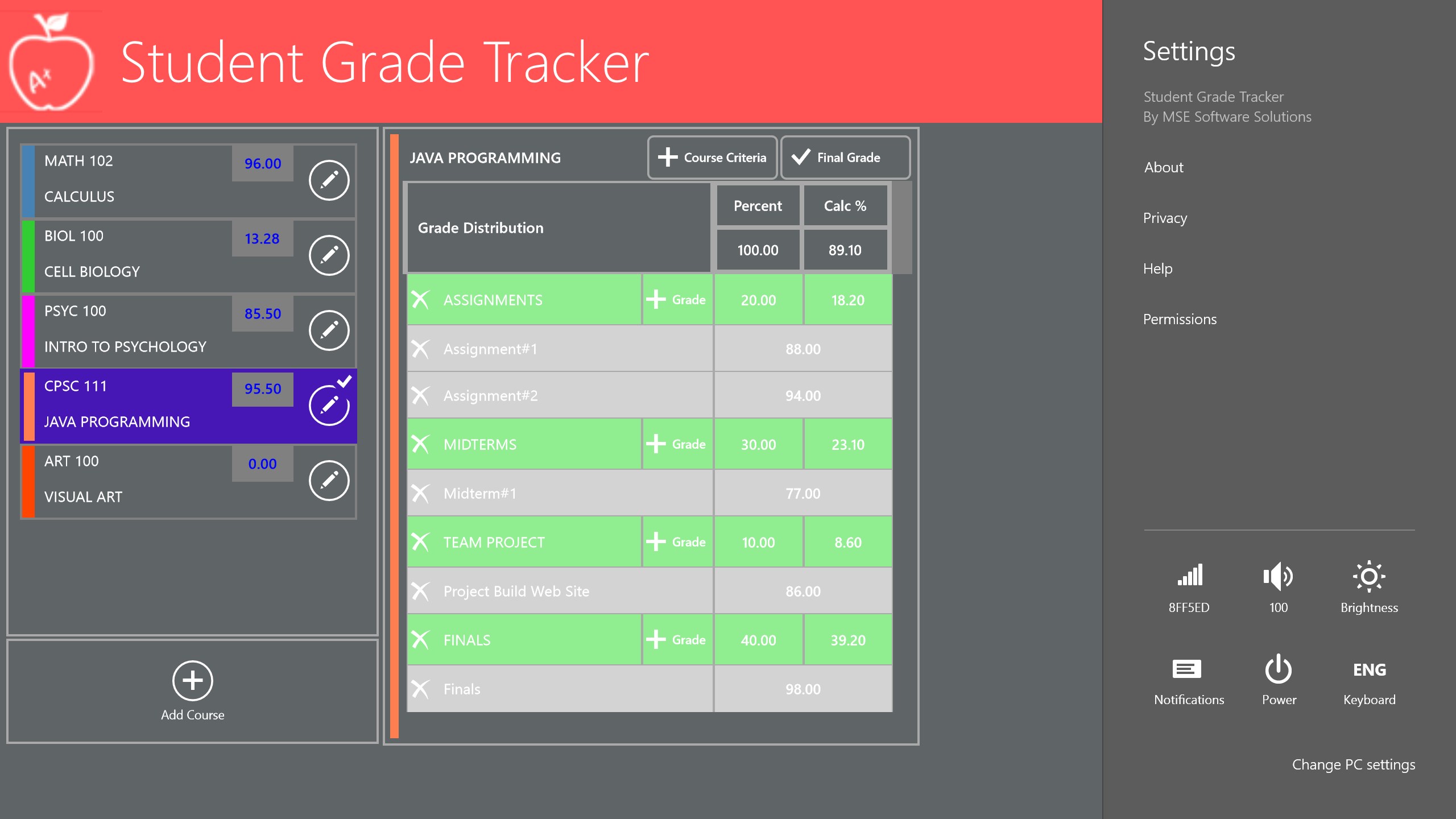 The STUDENT GRADE TRACKER application offers students the ability to predict or monitor their grade (percentage) standings based on each of their course’s grade distribution criteria and all marks awarded. Easy to use, works with a keyboard and mouse, and designed for the Microsoft Windows 8.1 Touch user interface to give you a great experience.
