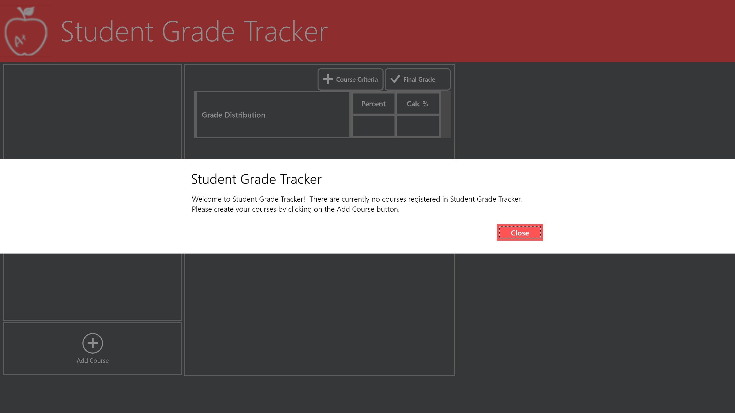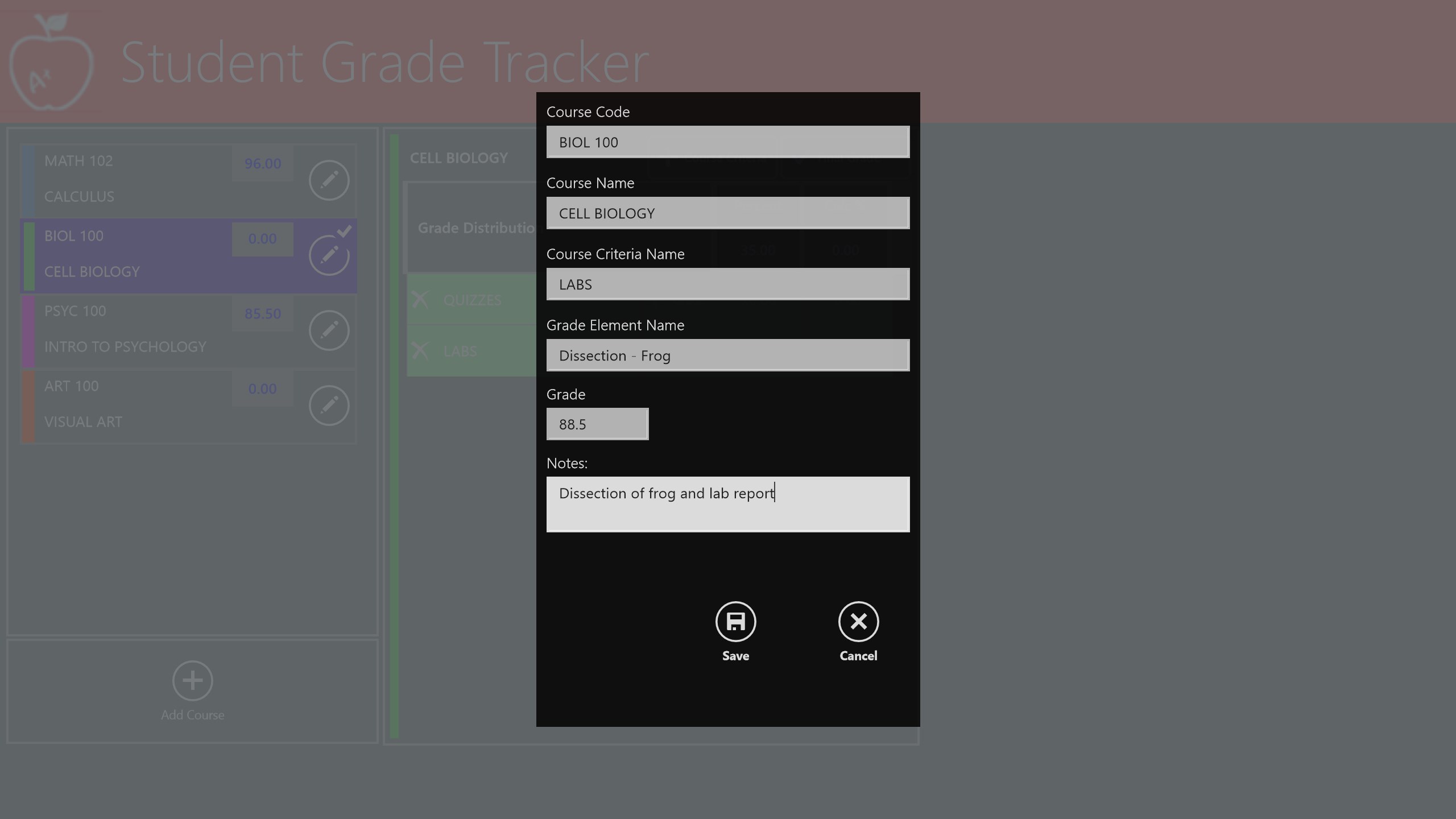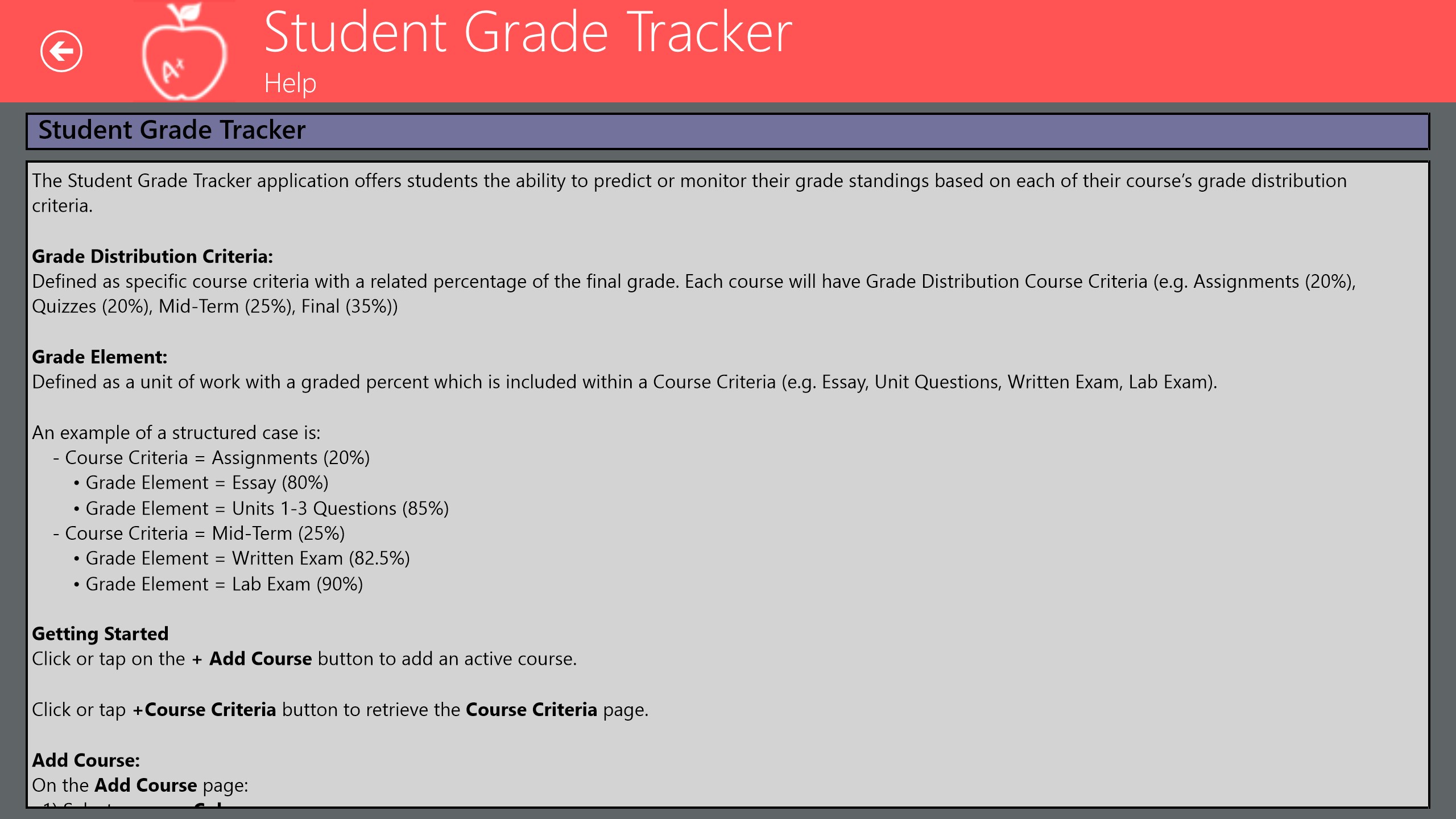 The STUDENT GRADE TRACKER application offers students the ability to predict or monitor their grade (percentage) standings based on each of their course’s grade distribution criteria and all marks awarded. Easy to use, works with a keyboard and mouse, and designed for the Microsoft Windows 8.1 Touch user interface to give you a great experience.