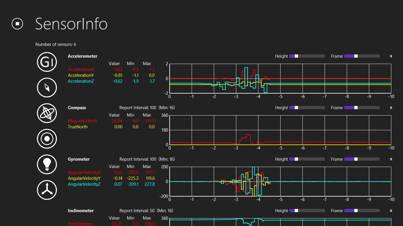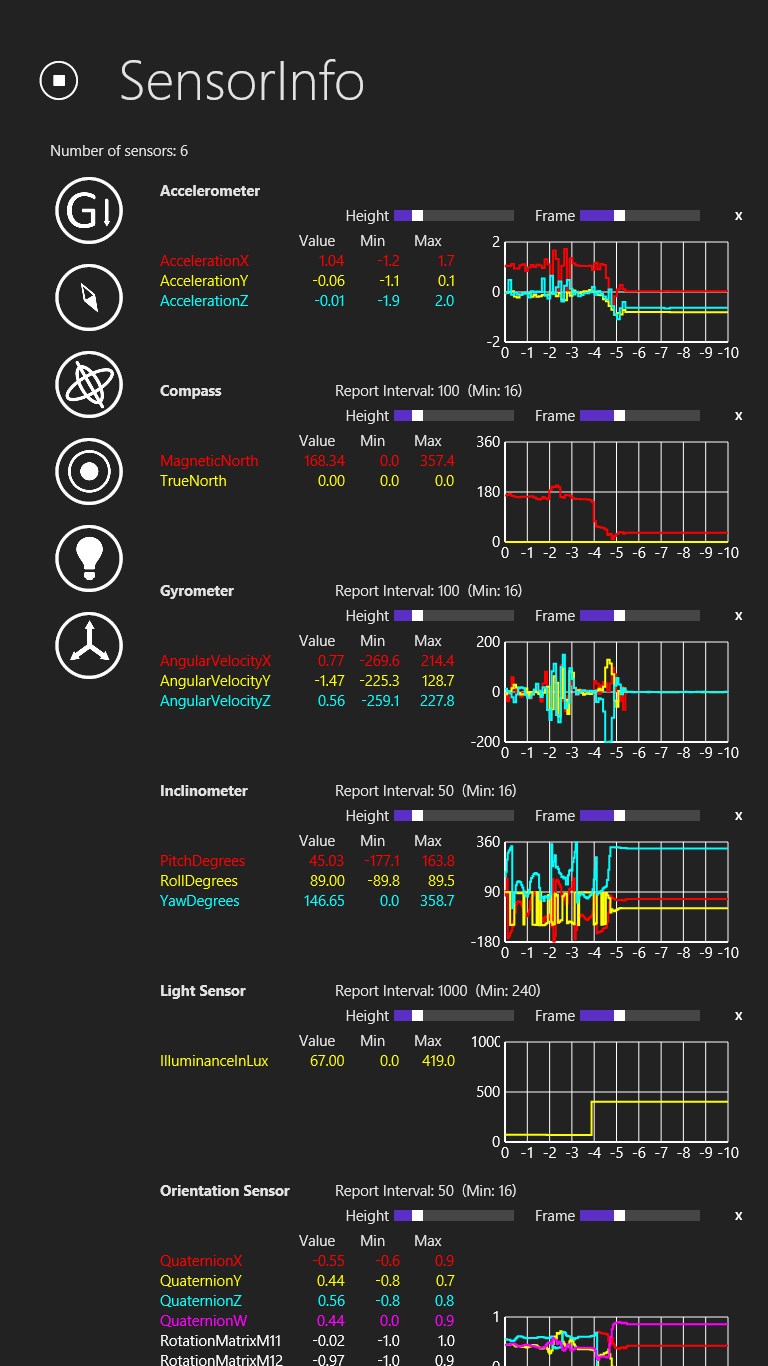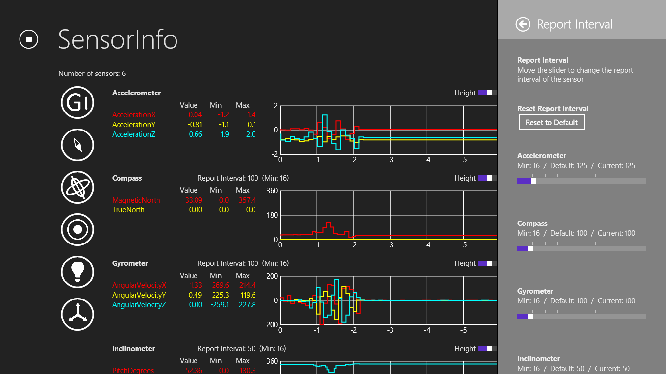 SensorInfo visualizes the information from different sensors, such as accelerometer, compass, gyrometer, inclinometer, light sensor, and orientation sensor. It can help us monitor the abnormal behavior of the sensors and verify if the report values are as expected. SensorInfo also provides a interface to set report interval of the sensors.