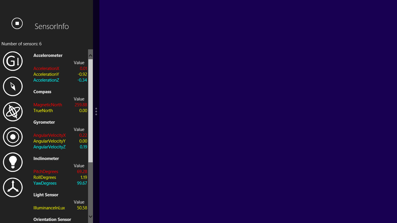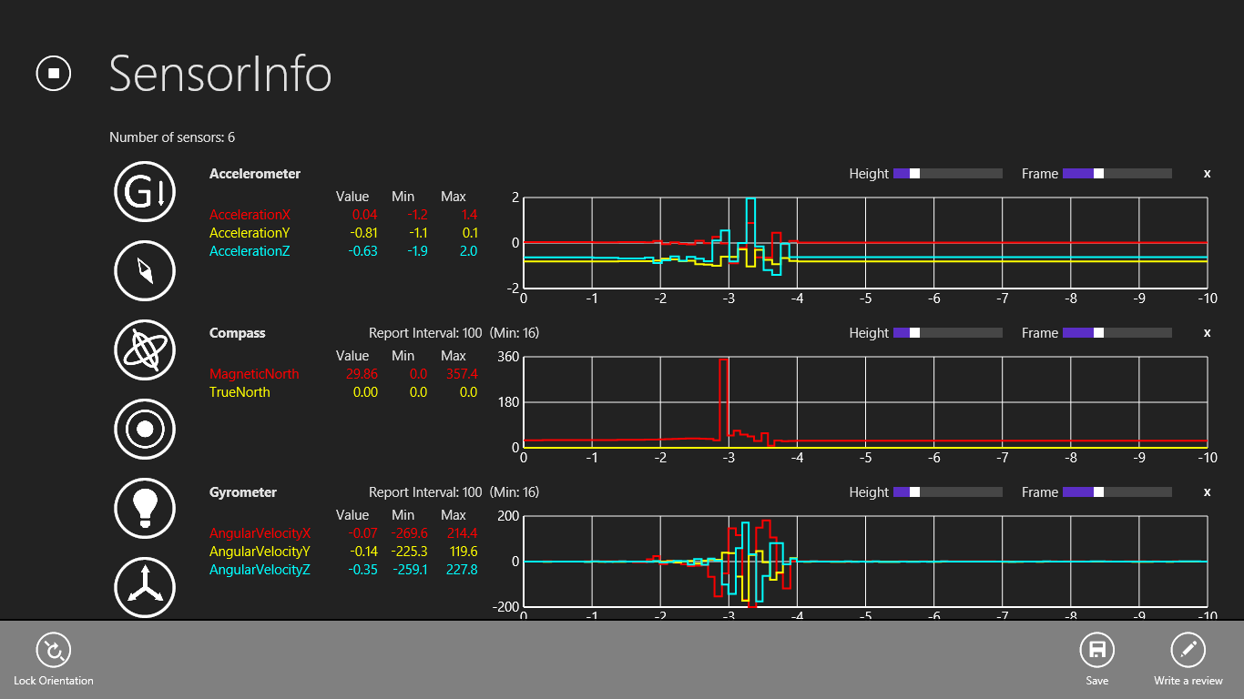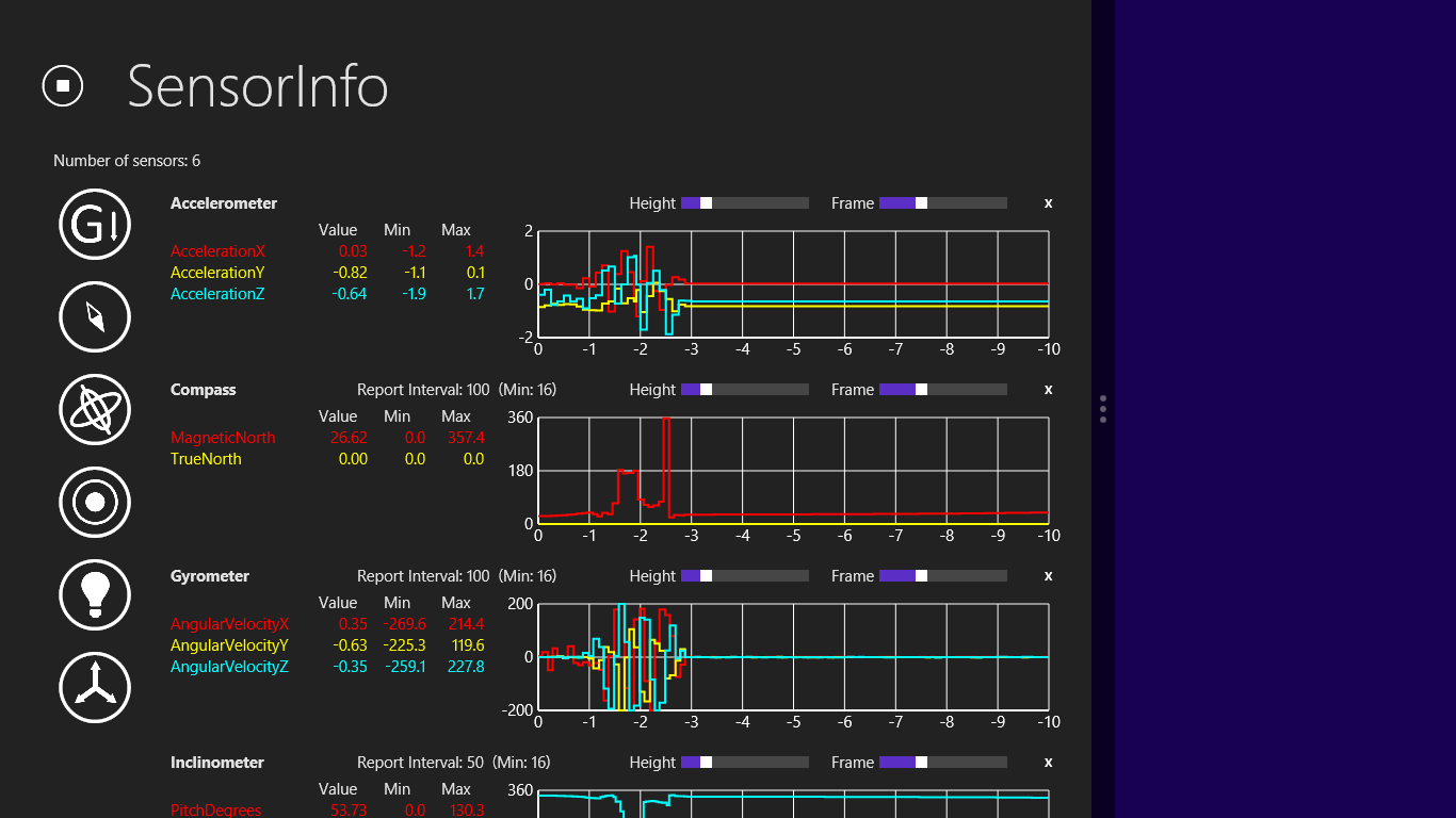 SensorInfo visualizes the information from different sensors, such as accelerometer, compass, gyrometer, inclinometer, light sensor, and orientation sensor. It can help us monitor the abnormal behavior of the sensors and verify if the report values are as expected. SensorInfo also provides a interface to set report interval of the sensors.