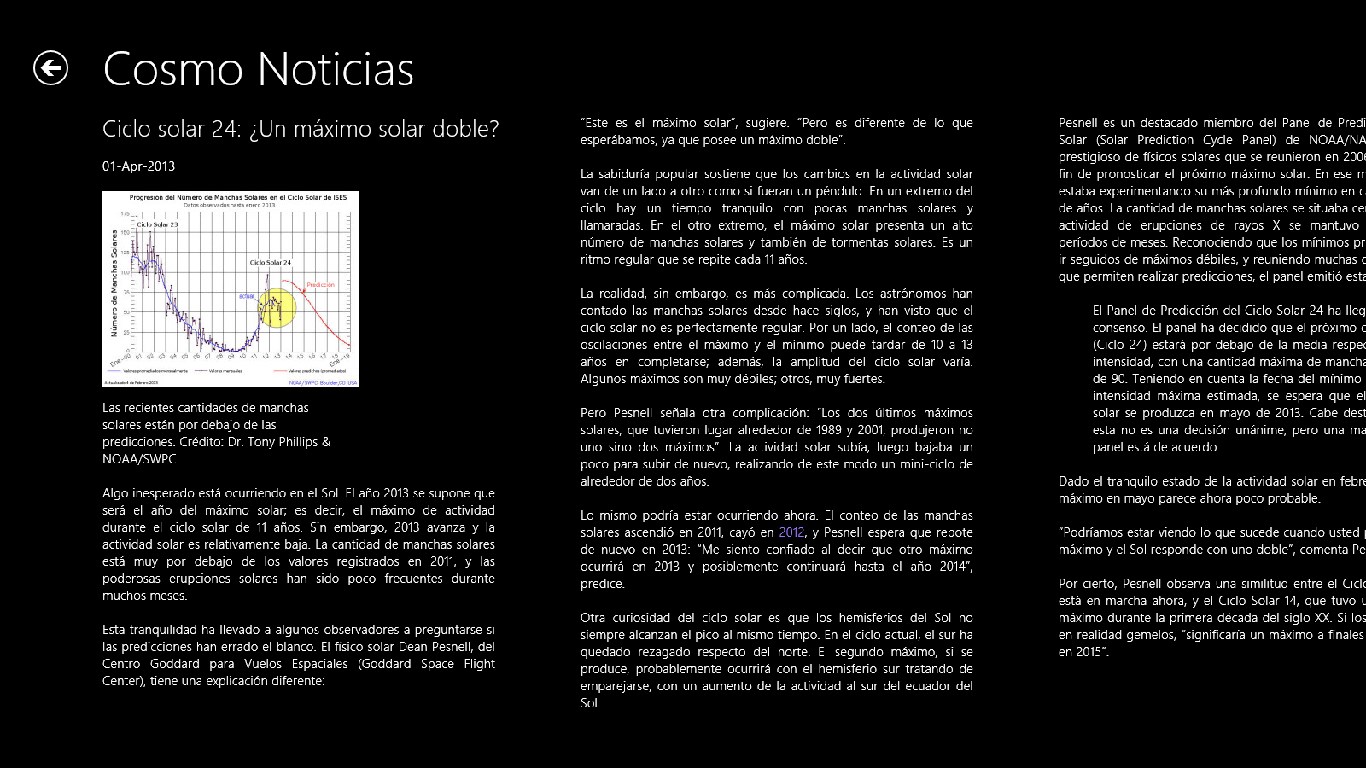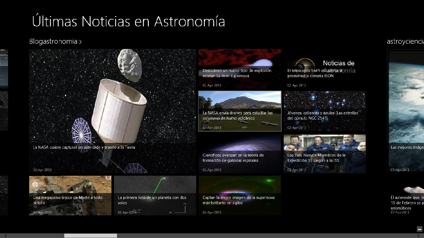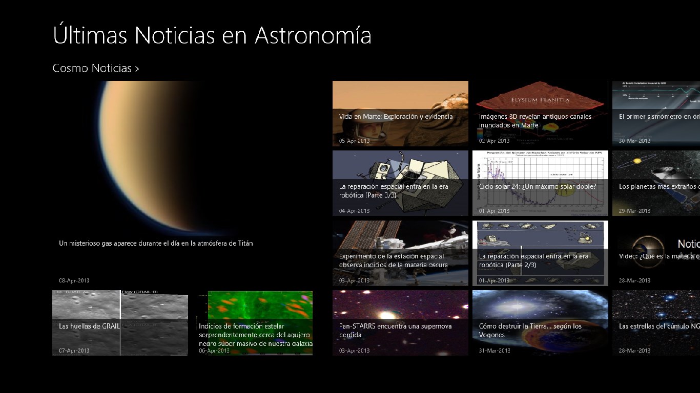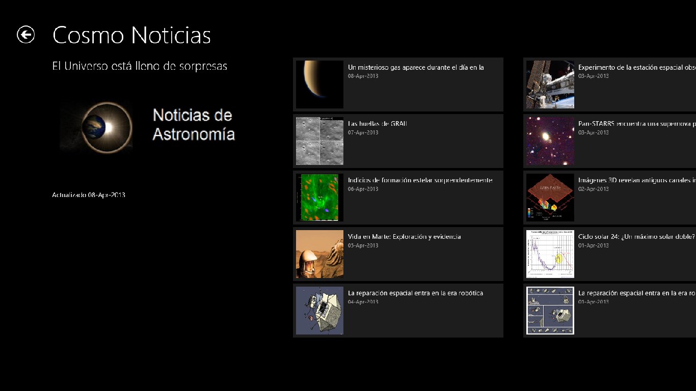 - Noticias sobre Astronomía en un moderno formato de Windows 8.- Las mejores Imágenes de planetas y estrellas recopiladas de Internet.- Análisis científicos y estadísticas con actualización periódica.- Dispositivos de exploración espacial.- Artículos de investigación.