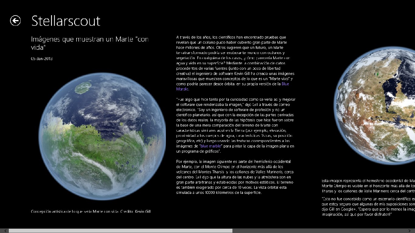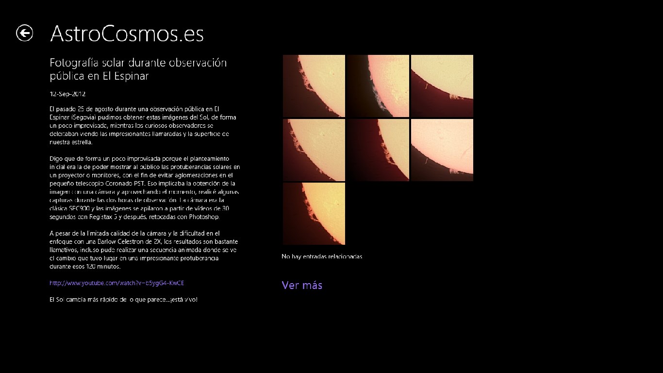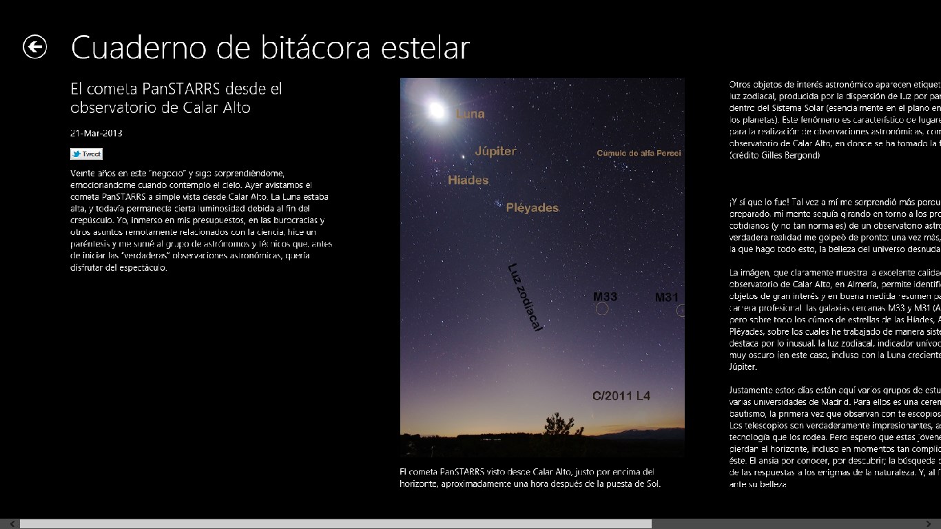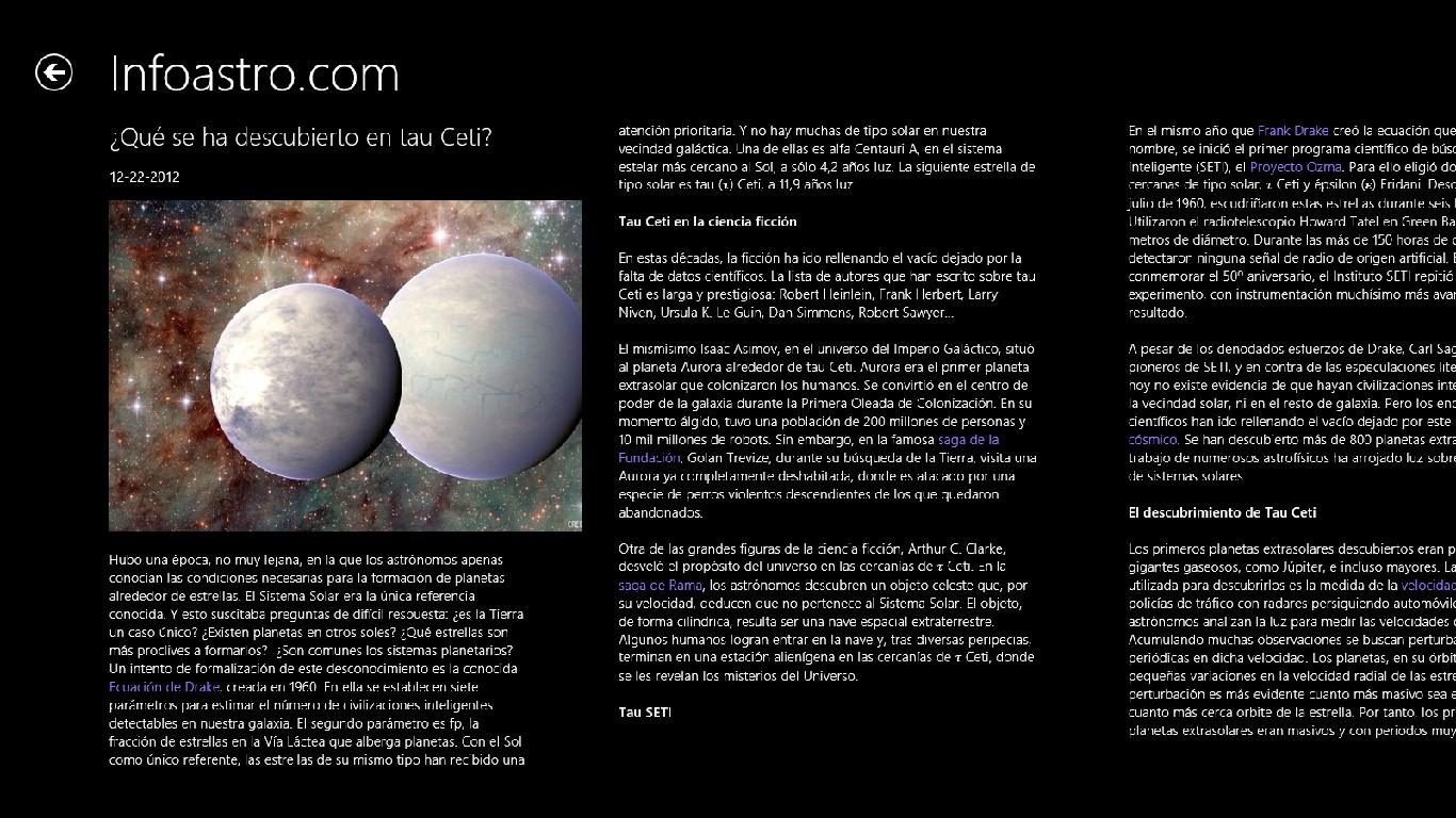 - Noticias sobre Astronomía en un moderno formato de Windows 8.- Las mejores Imágenes de planetas y estrellas recopiladas de Internet.- Análisis científicos y estadísticas con actualización periódica.- Dispositivos de exploración espacial.- Artículos de investigación.