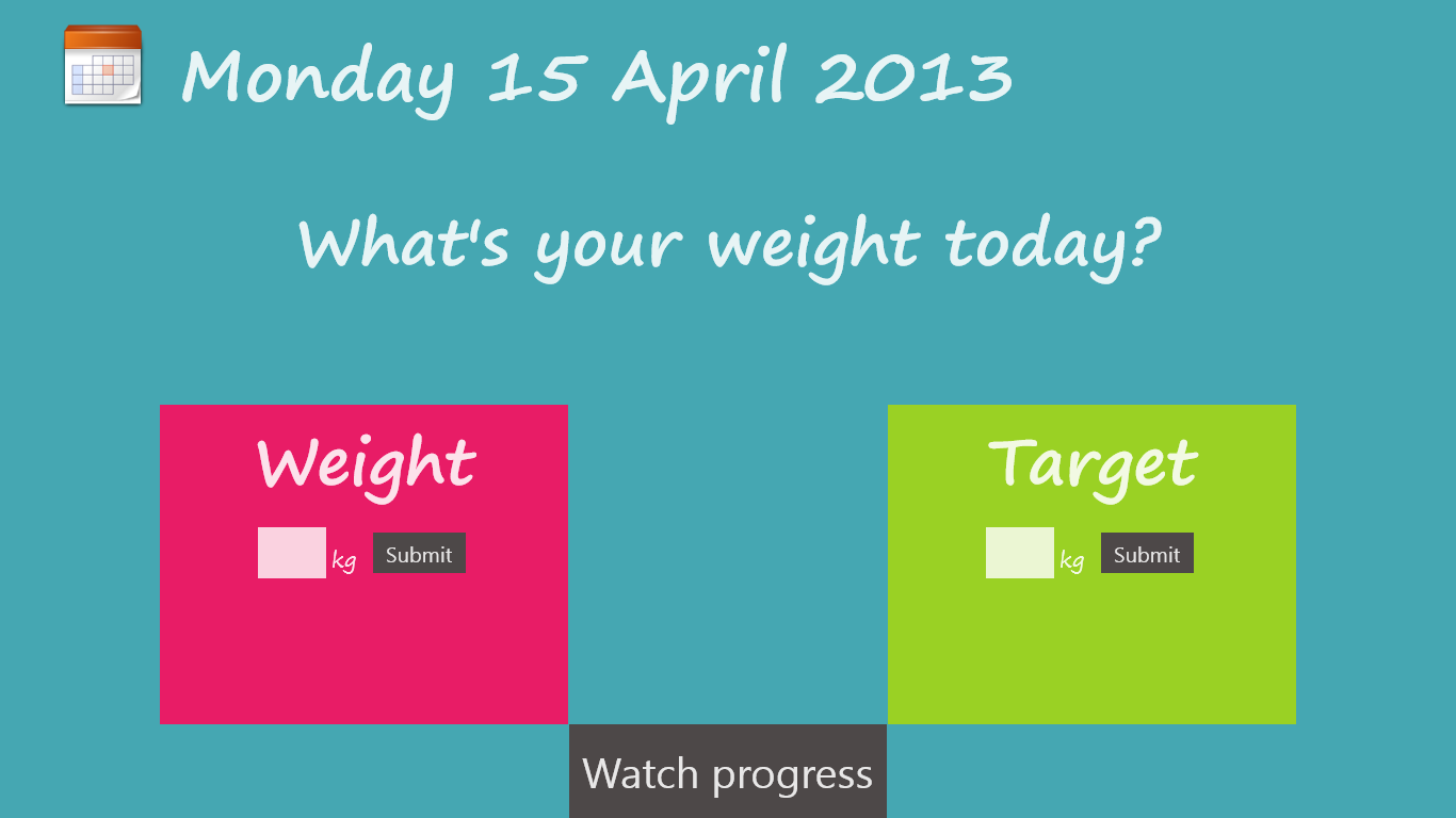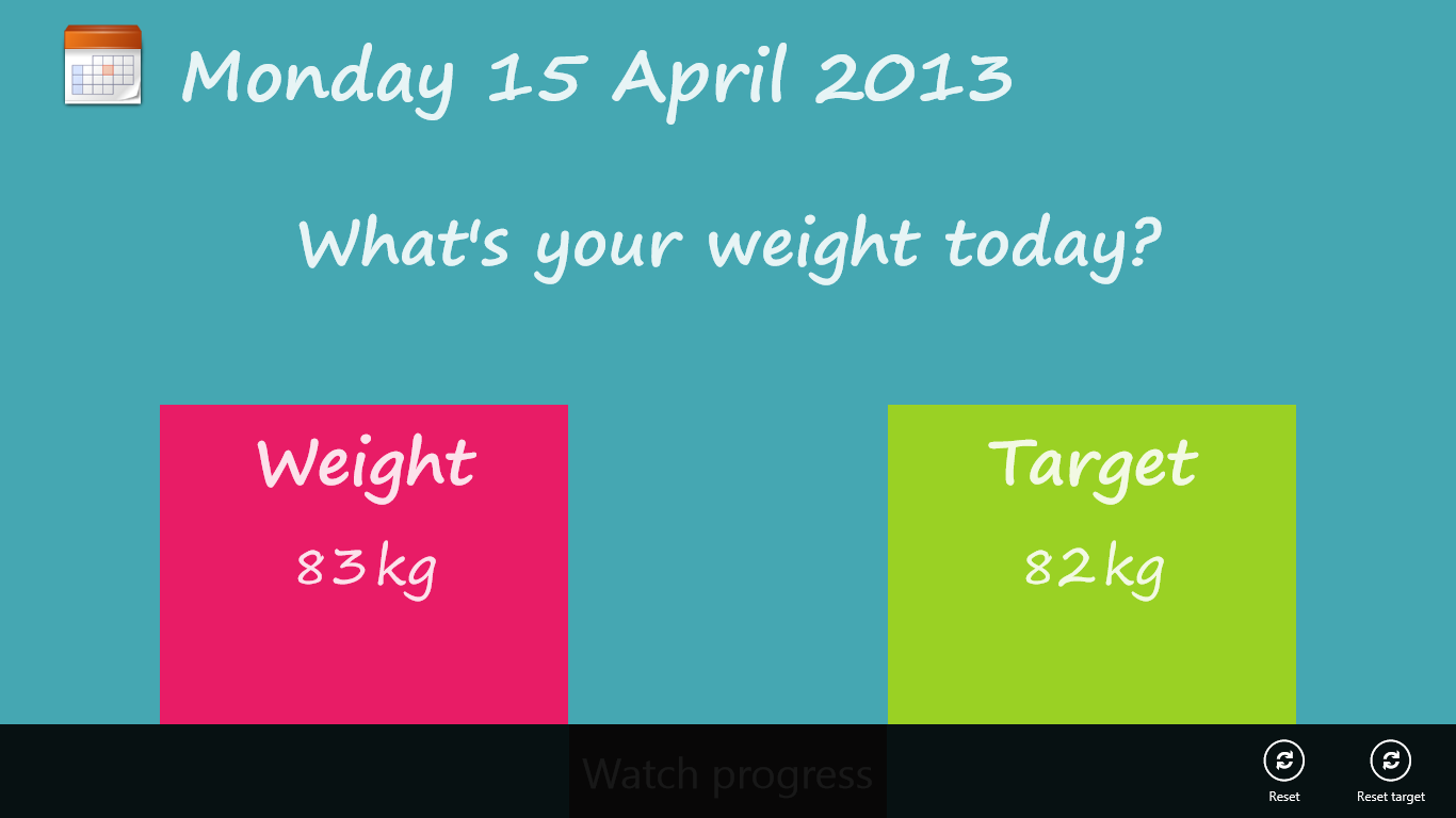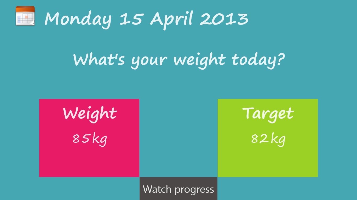 "What's your weight today?" keeps track on the evolution of your weight every day. The data is saved to your SkyDrive account so you can analyze your weight for a specific period any time on any Windows 8 device.