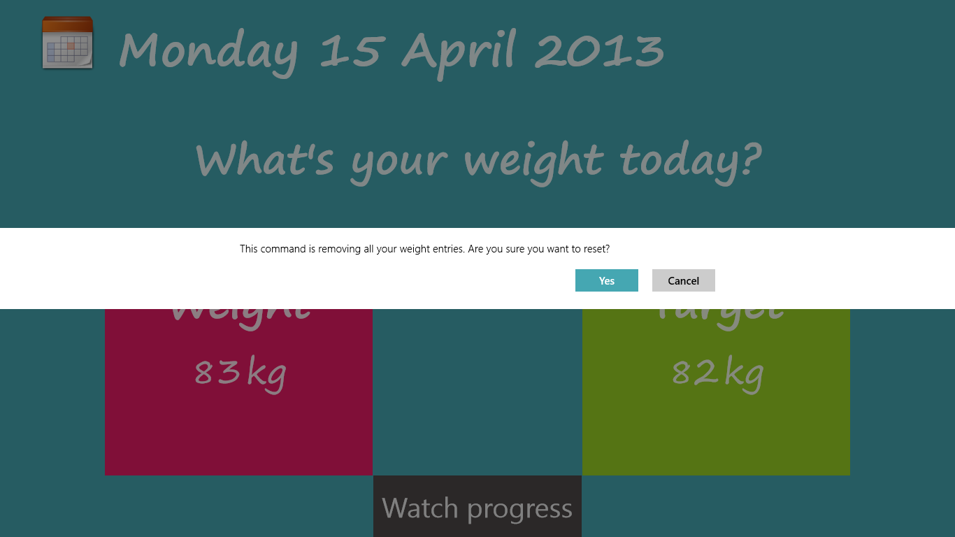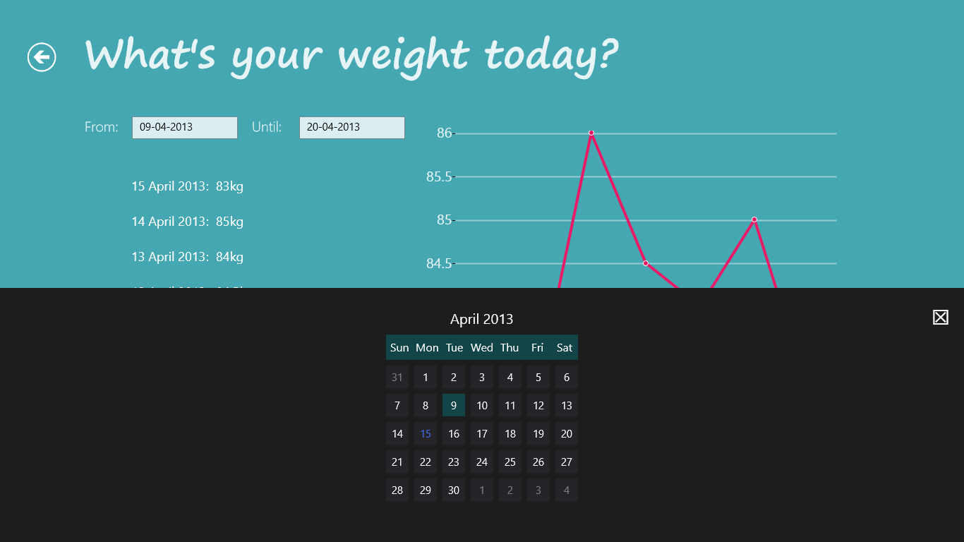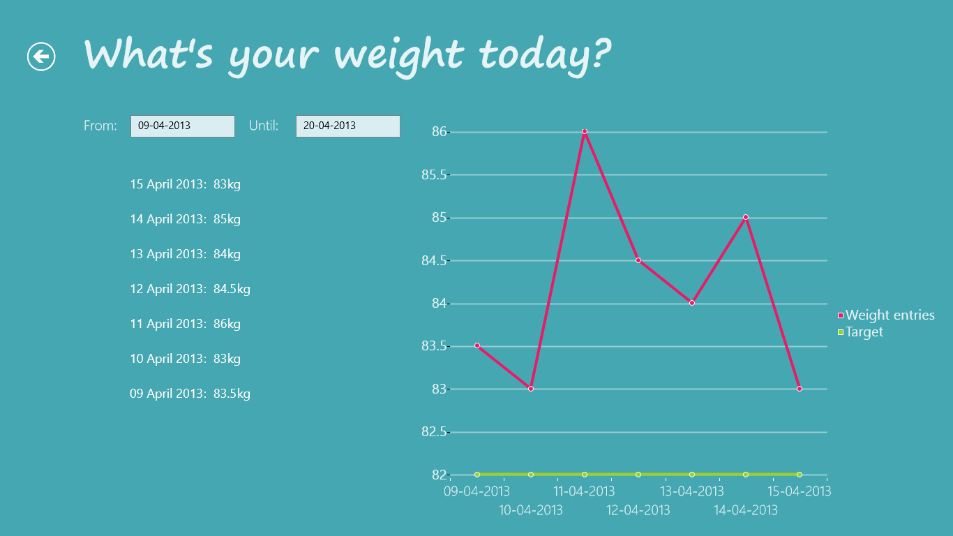 "What's your weight today?" keeps track on the evolution of your weight every day. The data is saved to your SkyDrive account so you can analyze your weight for a specific period any time on any Windows 8 device.