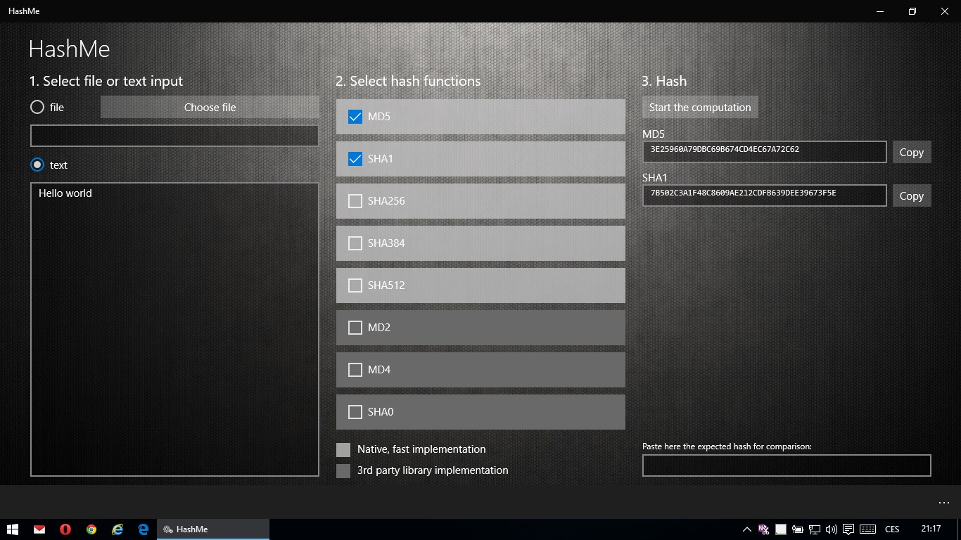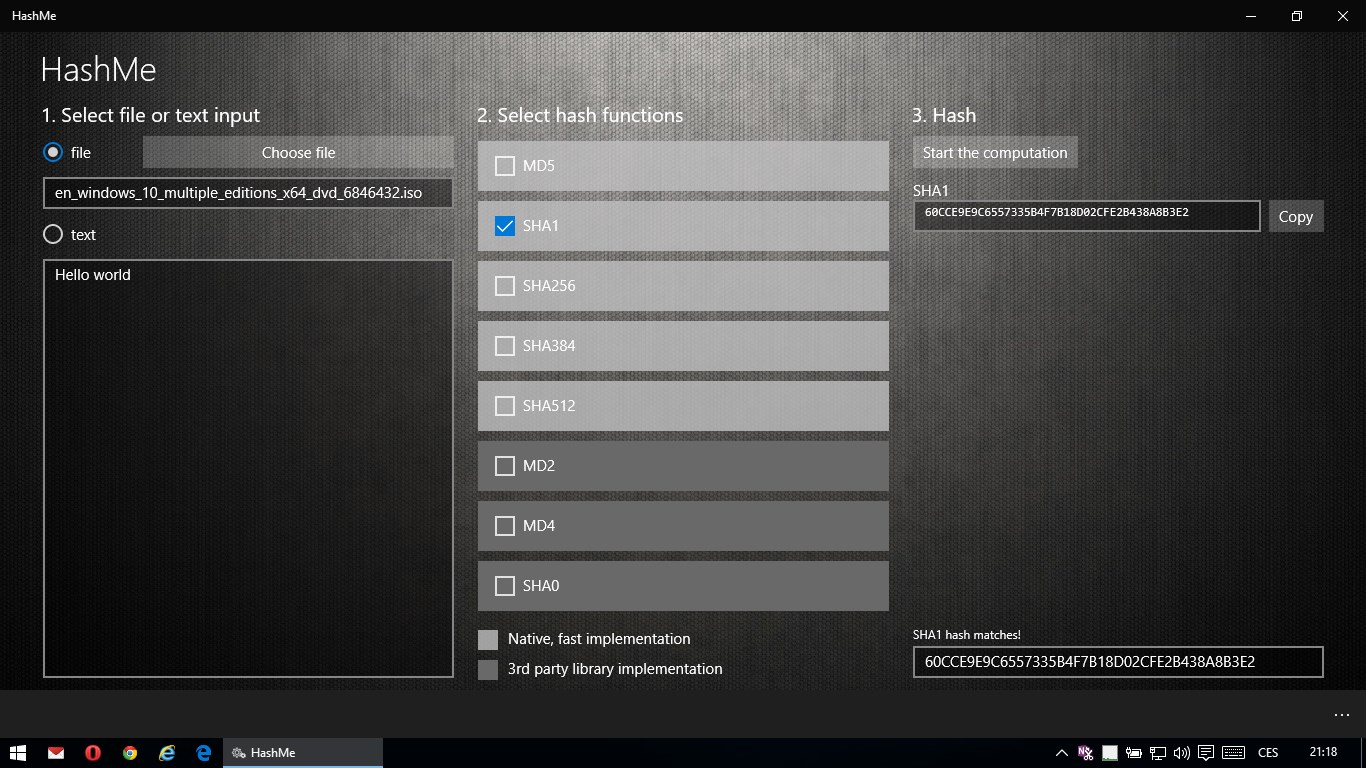 support for hashing text and files from any sourcefast, native implementation for MD5, SHA1, SHA256, SHA384 and SHA512MD2, MD4, SHA224, RIPEMD, Panama, Tiger and Snefru implemented using 3rd party libraryeasy File Drag&Drop (Windows 10)easy comparison between expected and actual hash valueShare Target contract - share your file into HashMe for instant hash