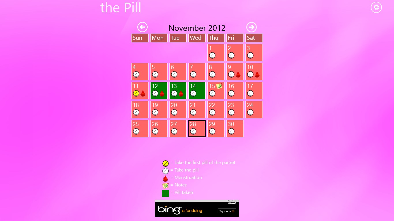 The calendar allows you to plan several months in advance when you should have your menstruation and what days you should take your pill.