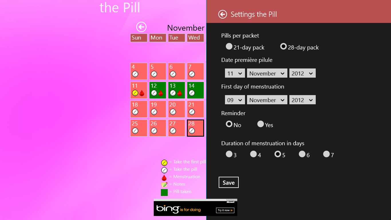 Calendar to take your pillCalendar to see your next menstruationReminder to take your pill