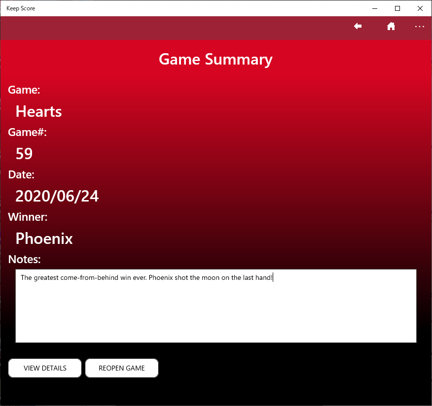 When you finish a game, the app records the stats and allows to you save notes about game highlights.