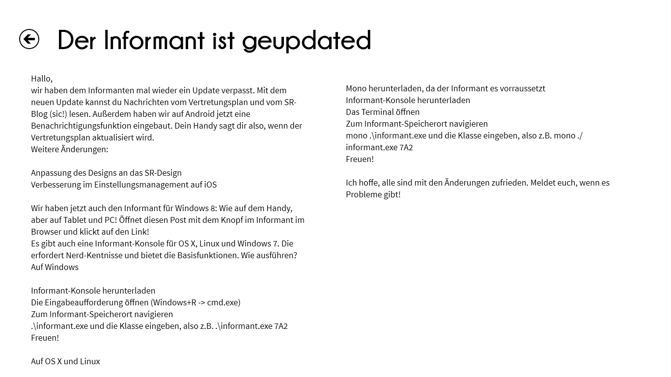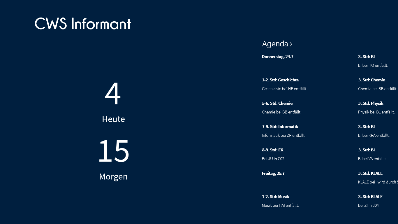 Mit dem CWS Informant kannst du, als Schüler der Christian-Wirth-Schule, schnell sehen, ob sich dein Stundenplan geändert hat und was es in der Schule Neues gibt. Er hilft dir so dabei, deinen Alltag unter Kontrolle zu kriegen!