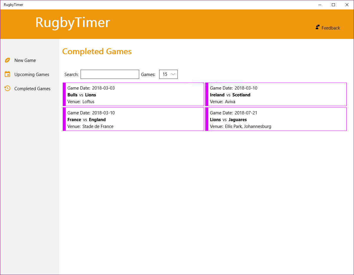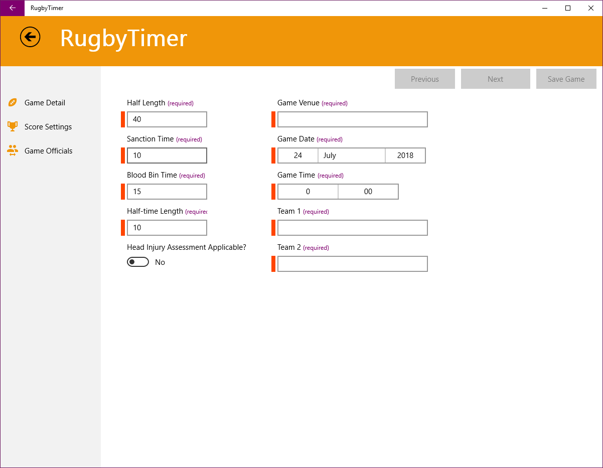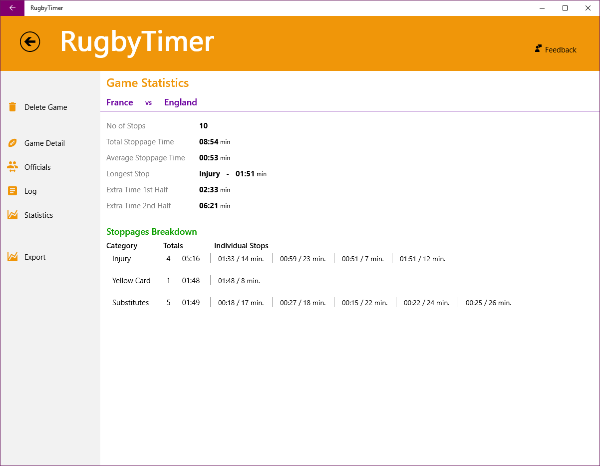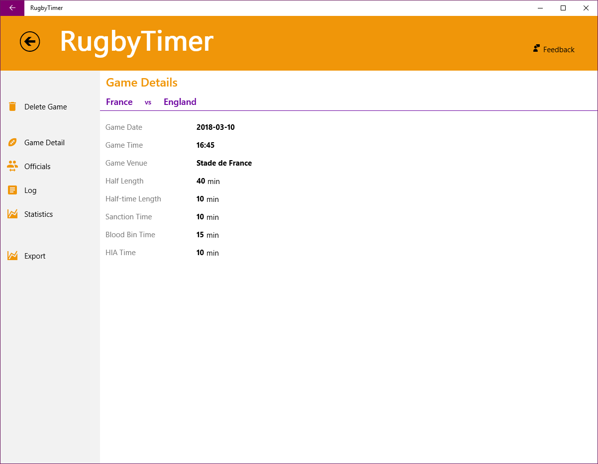 This application allows you to accurately perform the tasks required of a Time Keeper at a Rugby Union game. It saves all the games, upcoming and historic, so that you can access and/or start these games at a later point in time.