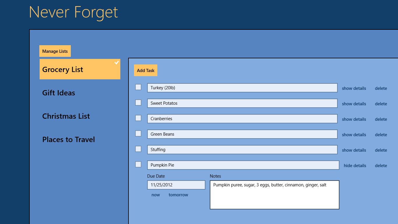 "Never Forget" your important tasks, todo lists, or groceries. This straightforward task management app will help you organize your life.